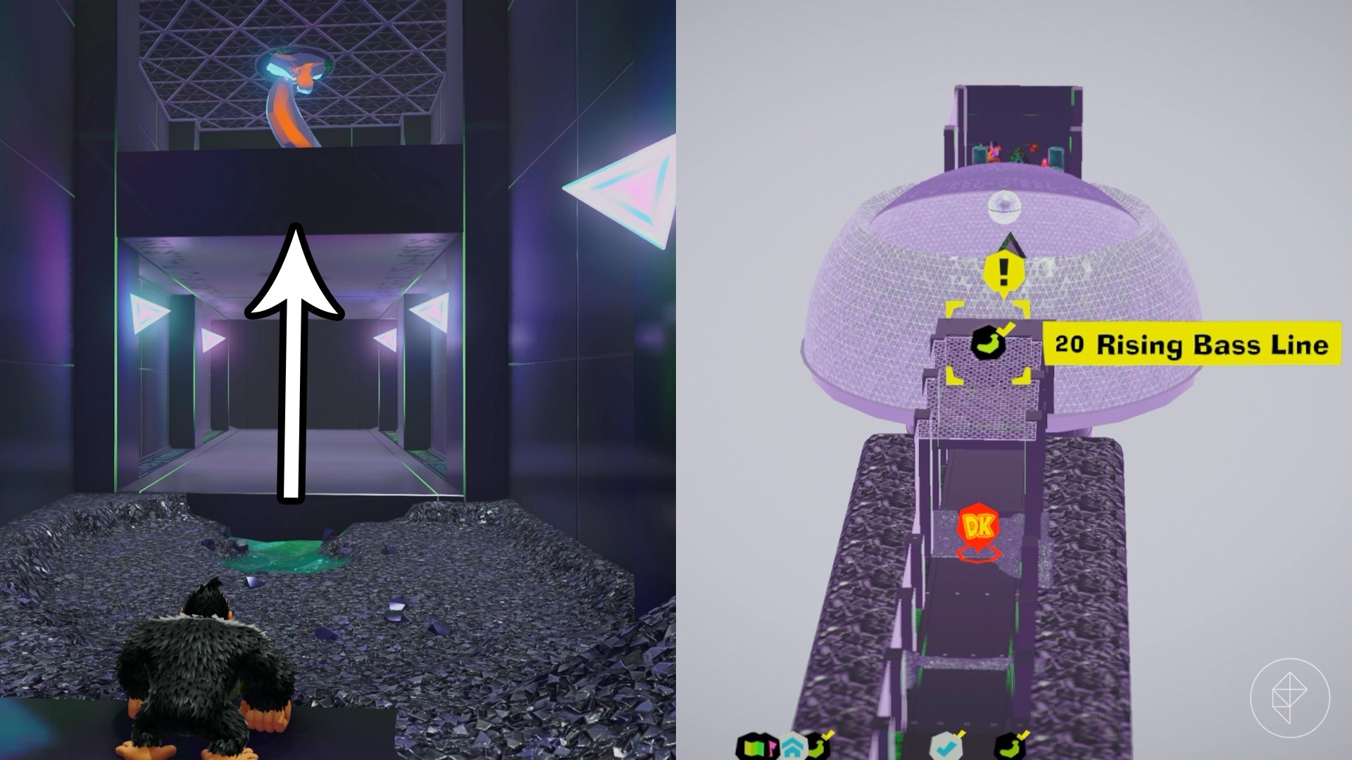 After you enter the hallway leading to the bass disc, you’ll find a patch of soft dirt that looks like gravel. Break the dirt to find a rubber bounce pad underneath. Dive punch the rubber and hold A to reach the higher floor where a banana is hanging from the ceiling.