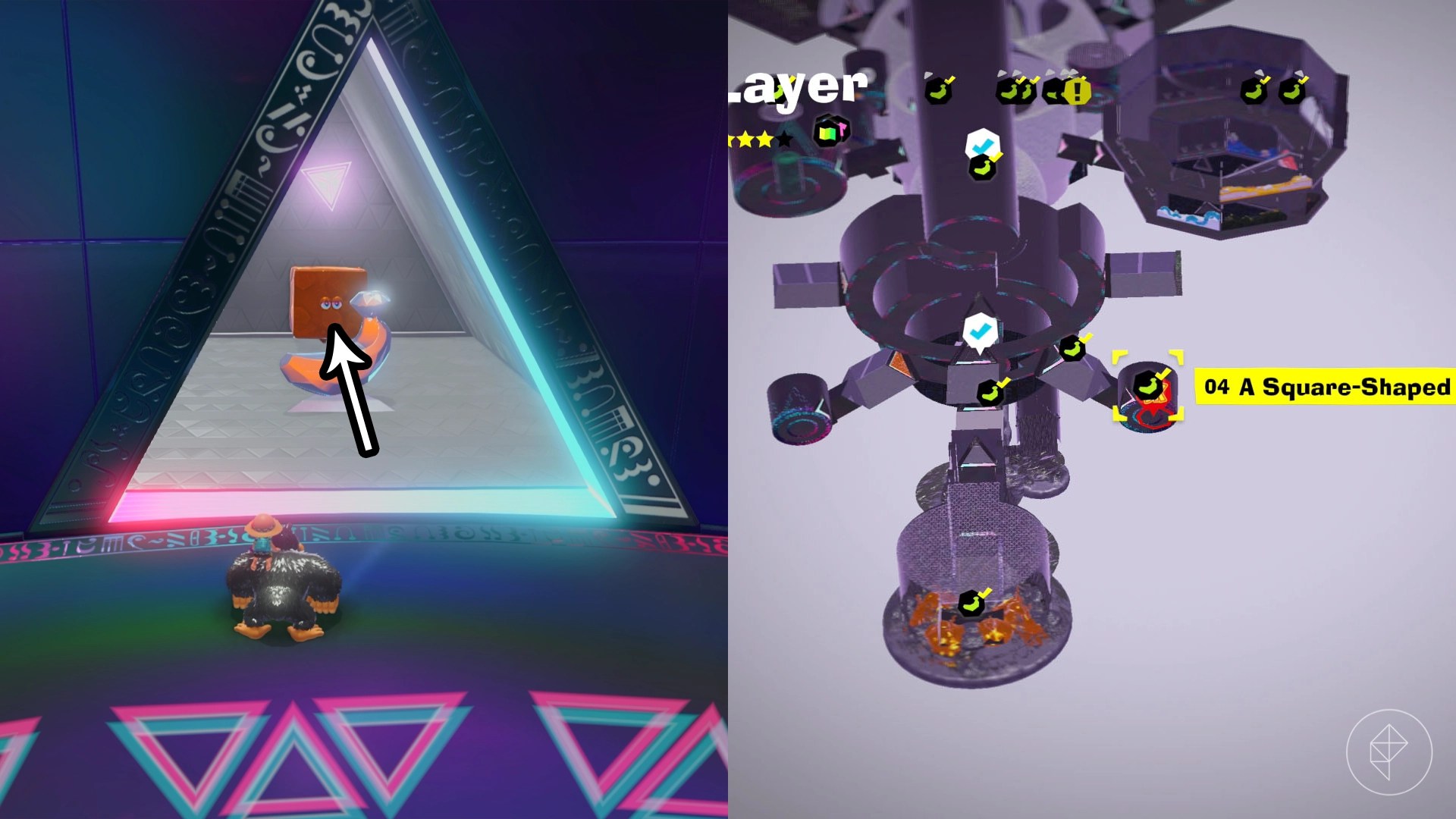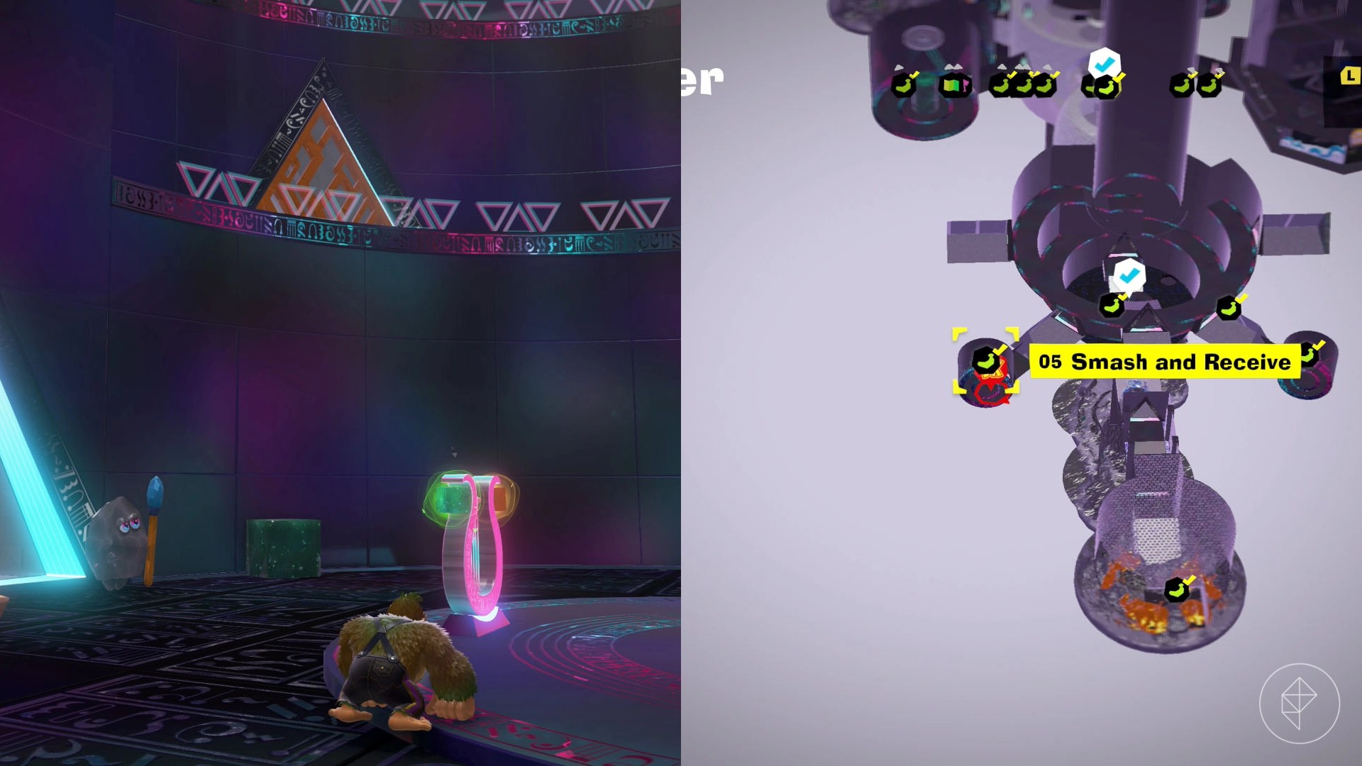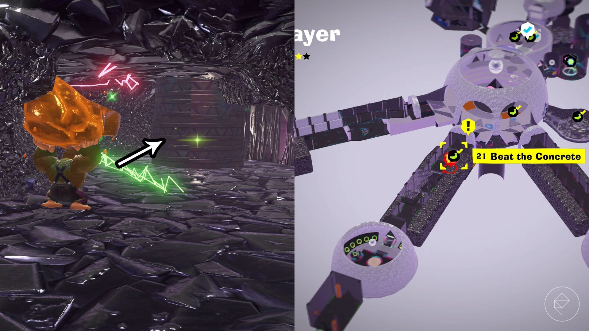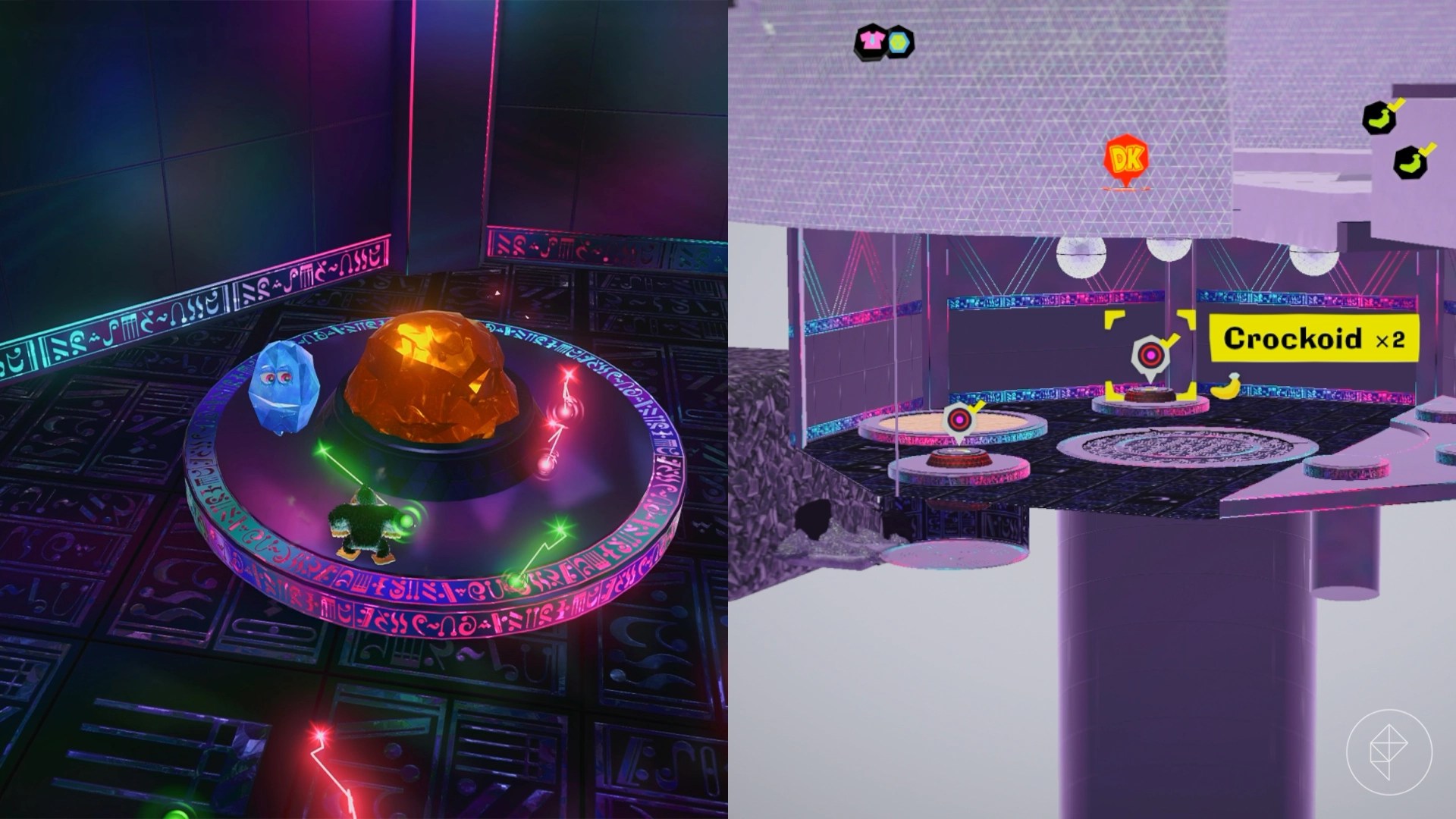 After you’ve restored the bass source, turn the floor around the large triangular speaker to gold. Break your way down to find a battle challenge blocked by rubber. Return up to the previous floor and hit a Swap Harp to turn the rubber into gold. Head back down and smash your way into the challenge to find two crockoids. When the crockoids are covered in black metal, they’re indestructible, so make sure to swap their material using the Swap Harp.