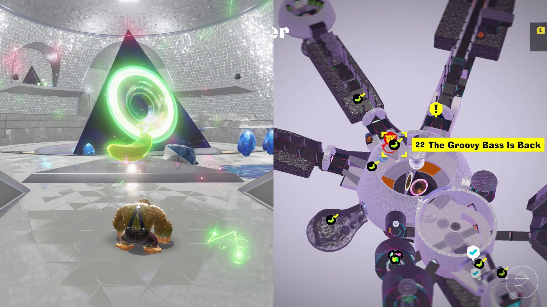 Hit the Swap Harp in the hallway to swap the large pillar behind the Fractone to gold. Break off a chunk of it and drop it onto the floor by pressing the L button. Hit the Swap Harp again to change the pillar back to rubber and head back into the room. Use the now rubber chunk on the floor as a jump pad to reach the top of the pillar and bounce your way to the banana.