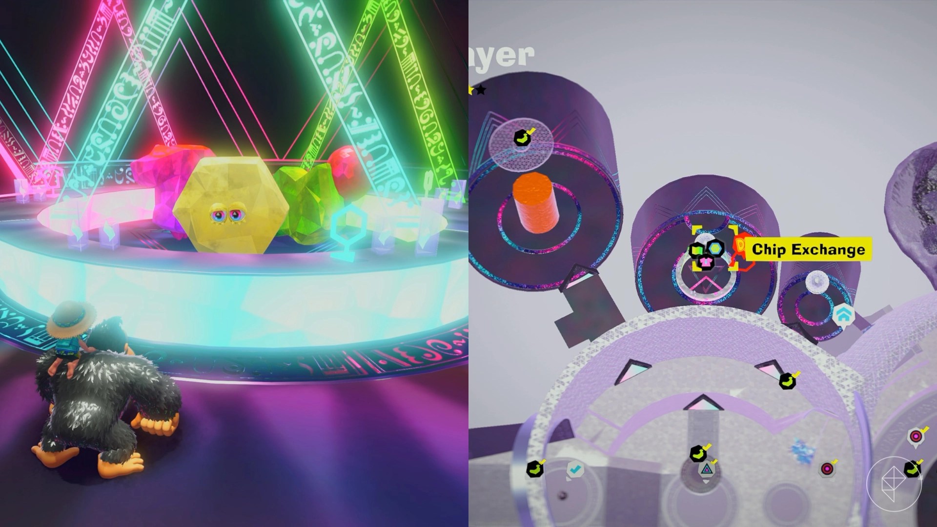From the Disco Hall tuning fork, head down the ramp and turn to the left to find a doorway that leads to all of the shops in the Disco Layer. Exchange Banandium Chips and gold at the Chip Exchange for a banana.