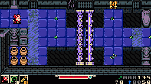 Like Shovel Knight’s 8-bit homages to games like Mega Man, Yacht Club wears its inspirations proudly on its sleeve. With a top-down camera, muted colors, and chunky pixels, Mina looks like it’s been ripped from a long-lost Game Boy Color cartridge. It sounds like one, too, with crunchy chiptunes providing staticky ambiance to Mina’s exploits. The world reminds me of Link’s Awakening, traveling across a grid of screens, solving puzzles, and defeating creatures like zombies, blobs, and hulking behemoths. However, Mina’s combat prowess takes more from Castlevania, cracking foes with a quick swing of her whip and utilizing secondary weapons called Sidearms like the arched toss of the Volt Hatchet or the boomeranging Gyro-Dagger. Like Castlevania, using Sidearms comes at the cost of Joules, a resource that needs replenishment with potions.