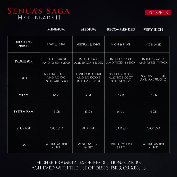 Below is a chart released by Ninja Theory detailing everything you need to know about running Senua’s Saga: Hellblade II at its most demanding, recommended specs, and even at the bare minimum. And as you can see, it’s a game that requires a lot of power (click the image to enlarge).