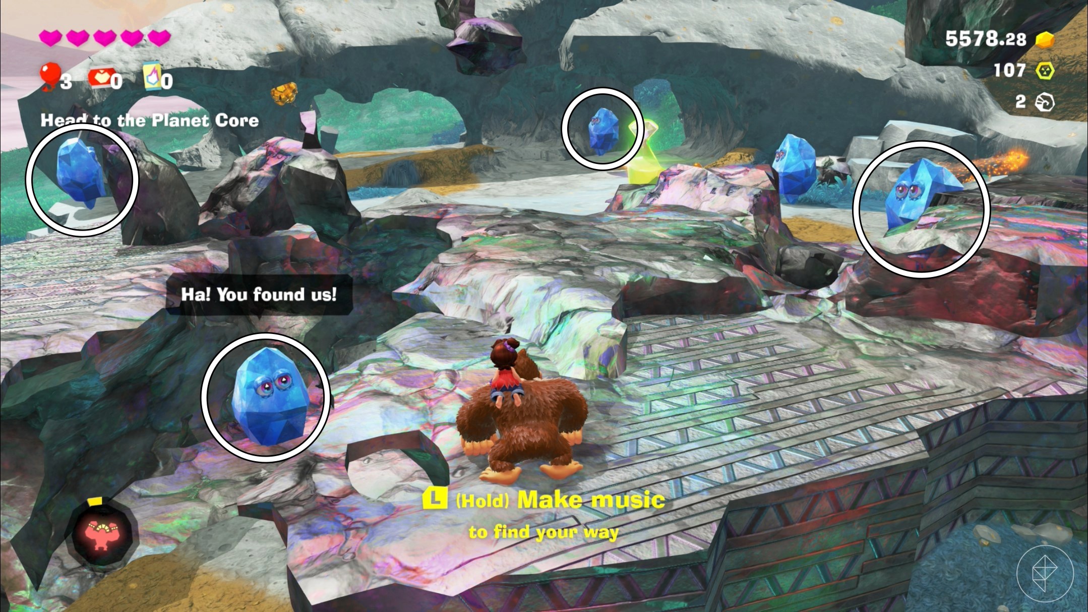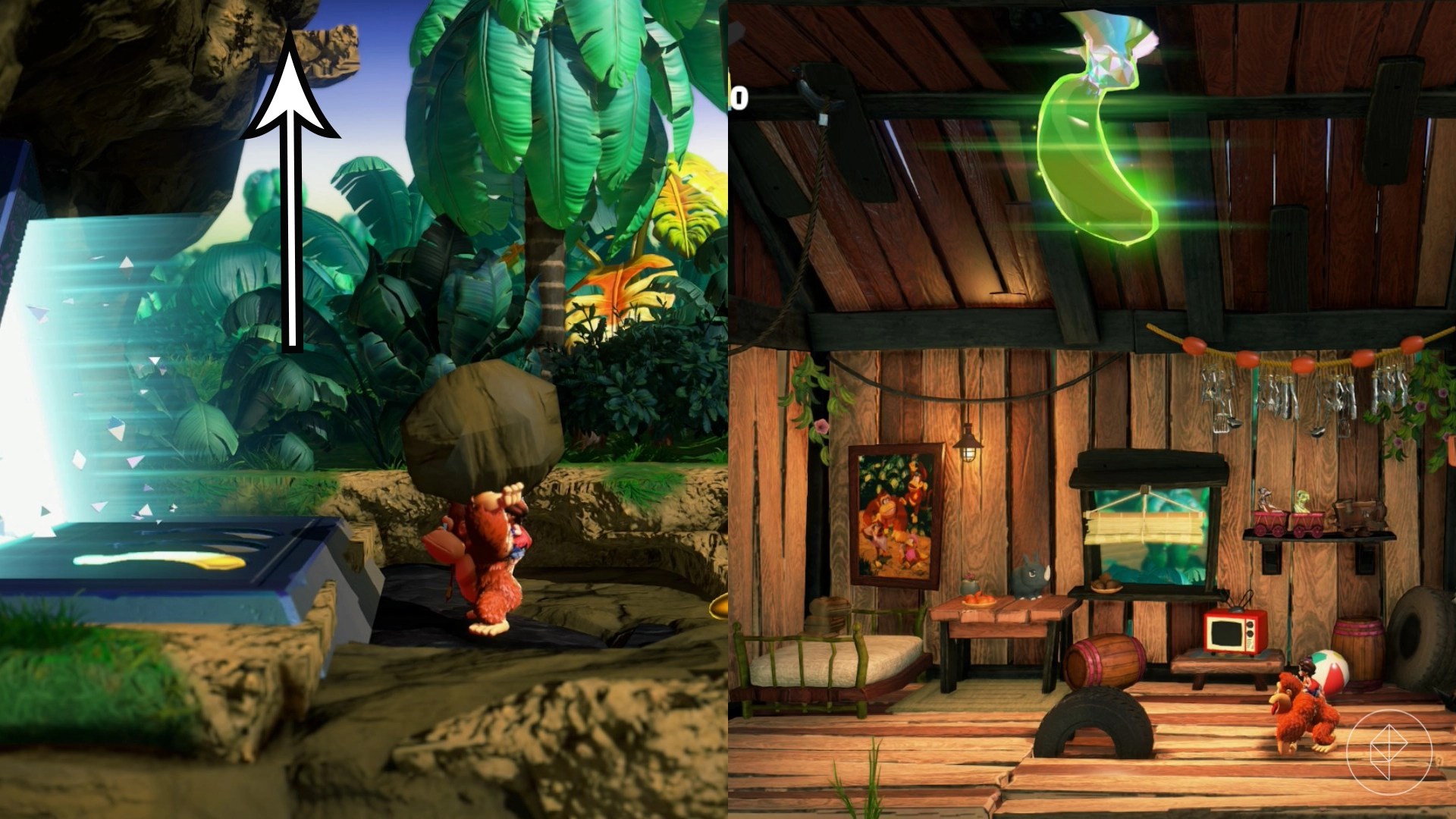 One is hidden inside the bananas, another is in a stone at the bottom end of it, and two are encased in concrete on the nearby platform (you can use Kong Bananaza to break them free). We’ve circled where to find them approximately above. Get all four and a gem will appear.