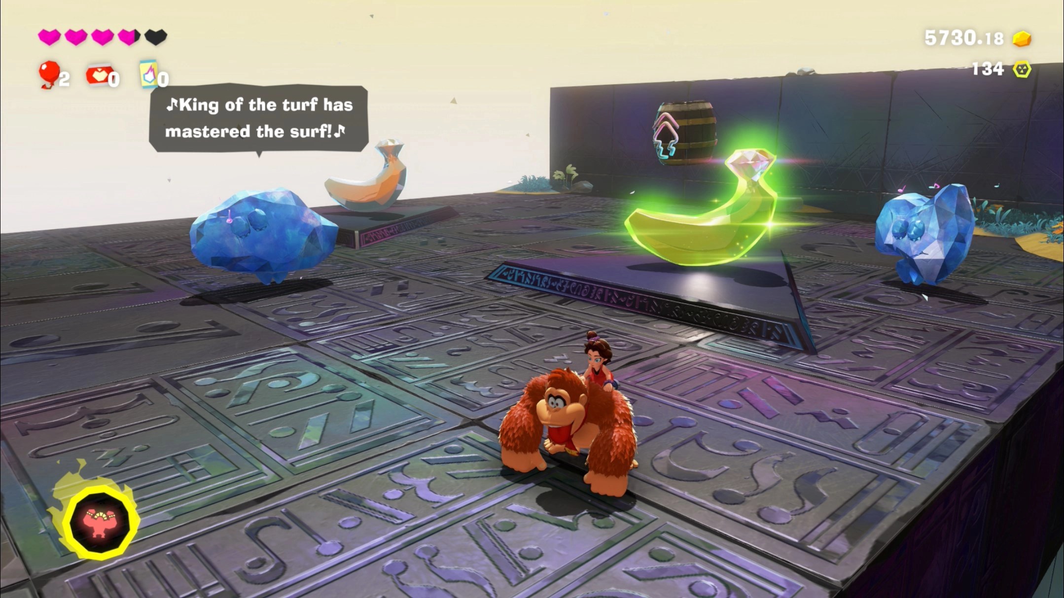 Climb the stone banana near the Quiztone (see above). Look at the sky and you’ll see Cranky standing on an unreachable platform. Toss a chunk on it to drag the platform to the ground. Talk to Cranky when he lands, listen to his rant, and get a gem.