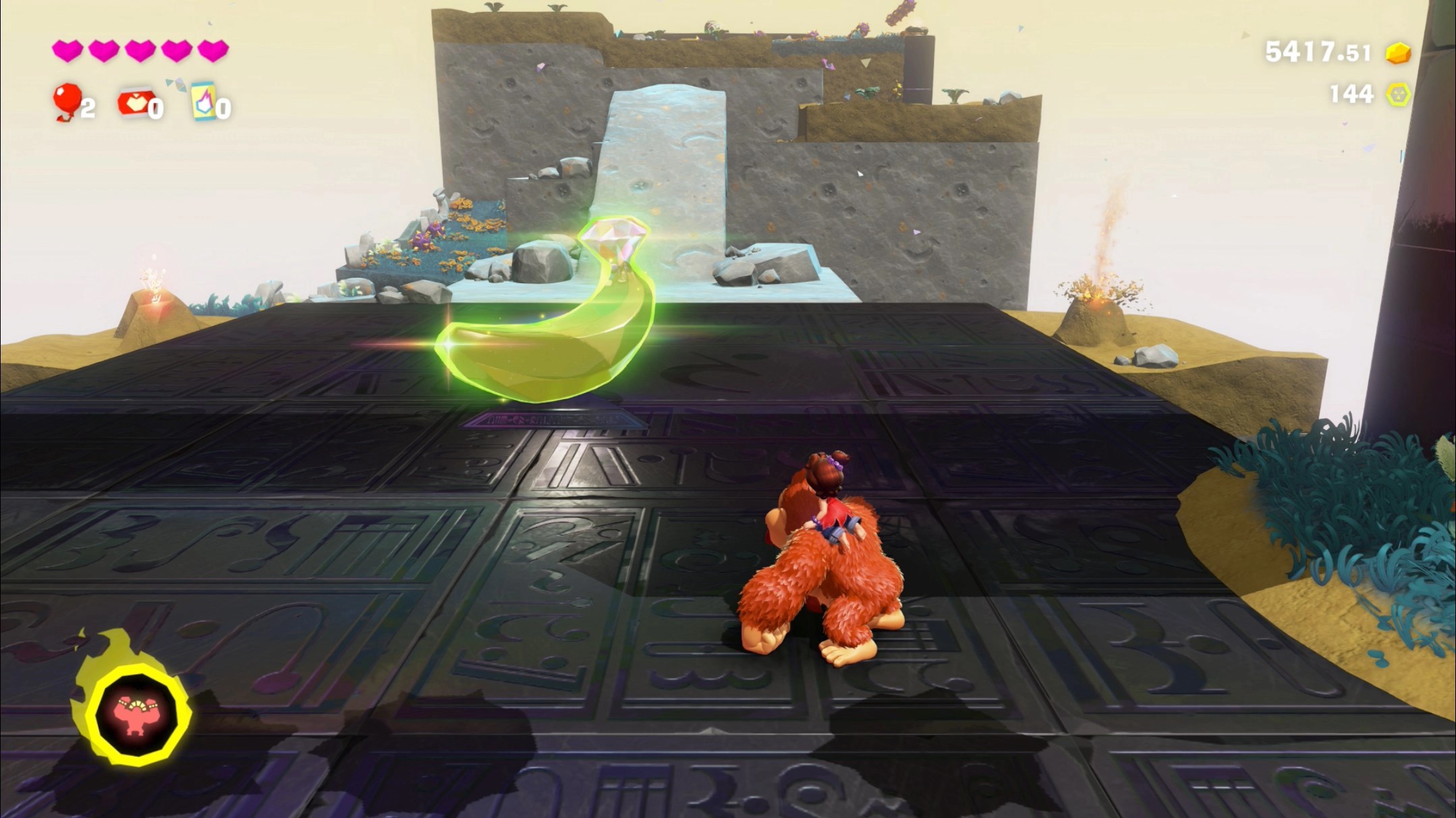 There’s a cave to the left of Peel Peak (if you’re standing at the stem facing the bananas). Activate the challenge inside, where you’ll have to smash a rotating wall within 20 seconds to get a gem.