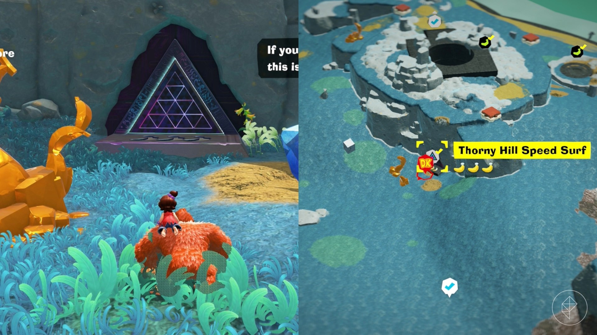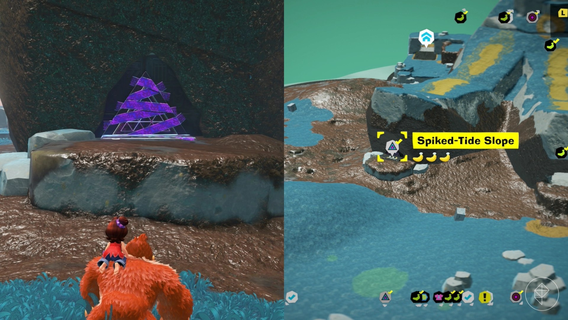 When facing Fractone Village at the Surf Hills teeleport spot, drop down the cliff side on the right to see a cave entrance into the giant stone banana. Use your Kong Bananza ability to smash through the walls, where you’ll get to this banana hanging from the ceiling.
