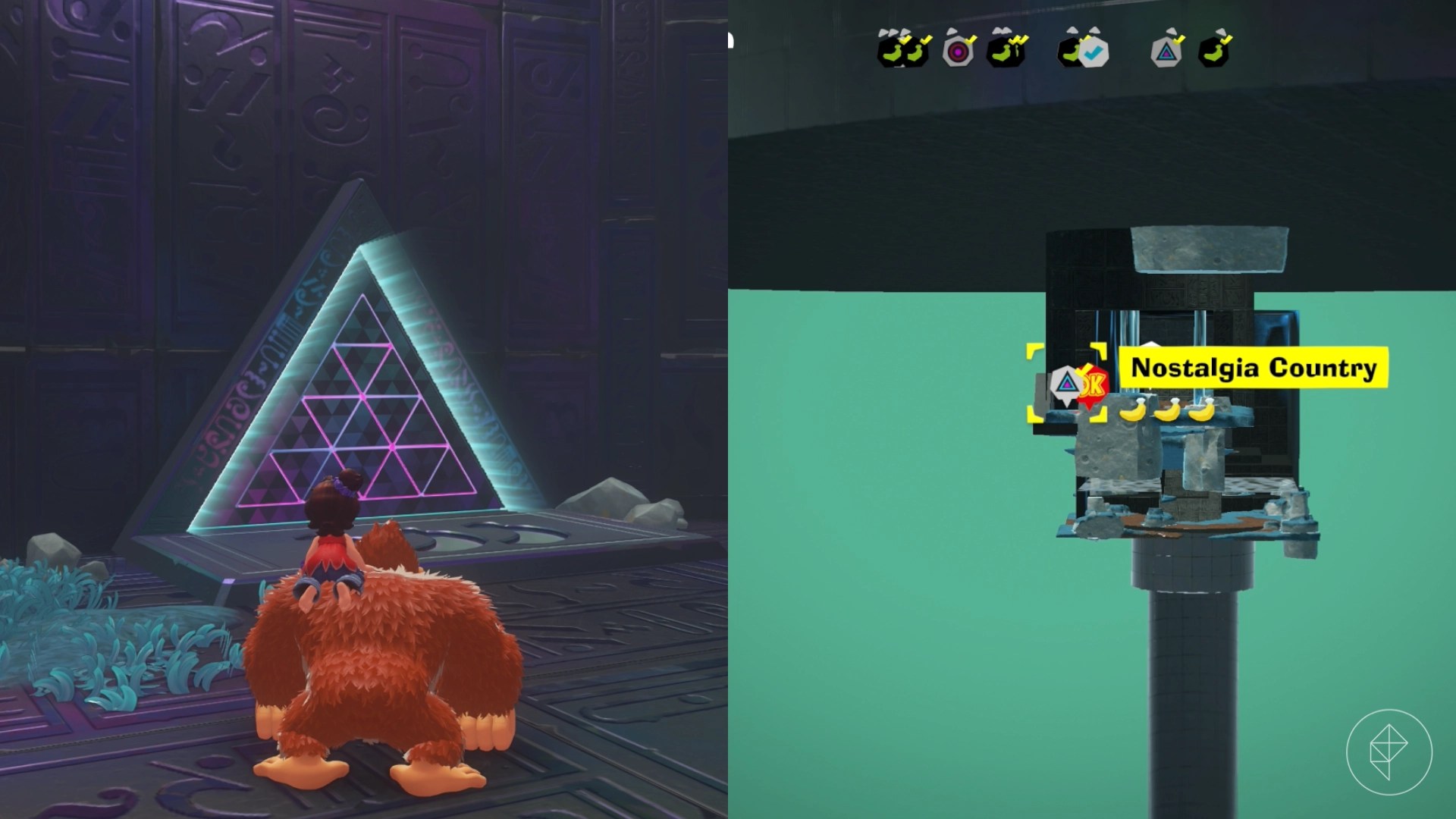 One is hidden inside the bananas, another is in a stone at the bottom end of it, and two are encased in concrete on the nearby platform (you can use Kong Bananaza to break them free). We’ve circled where to find them approximately above. Get all four and a gem will appear.