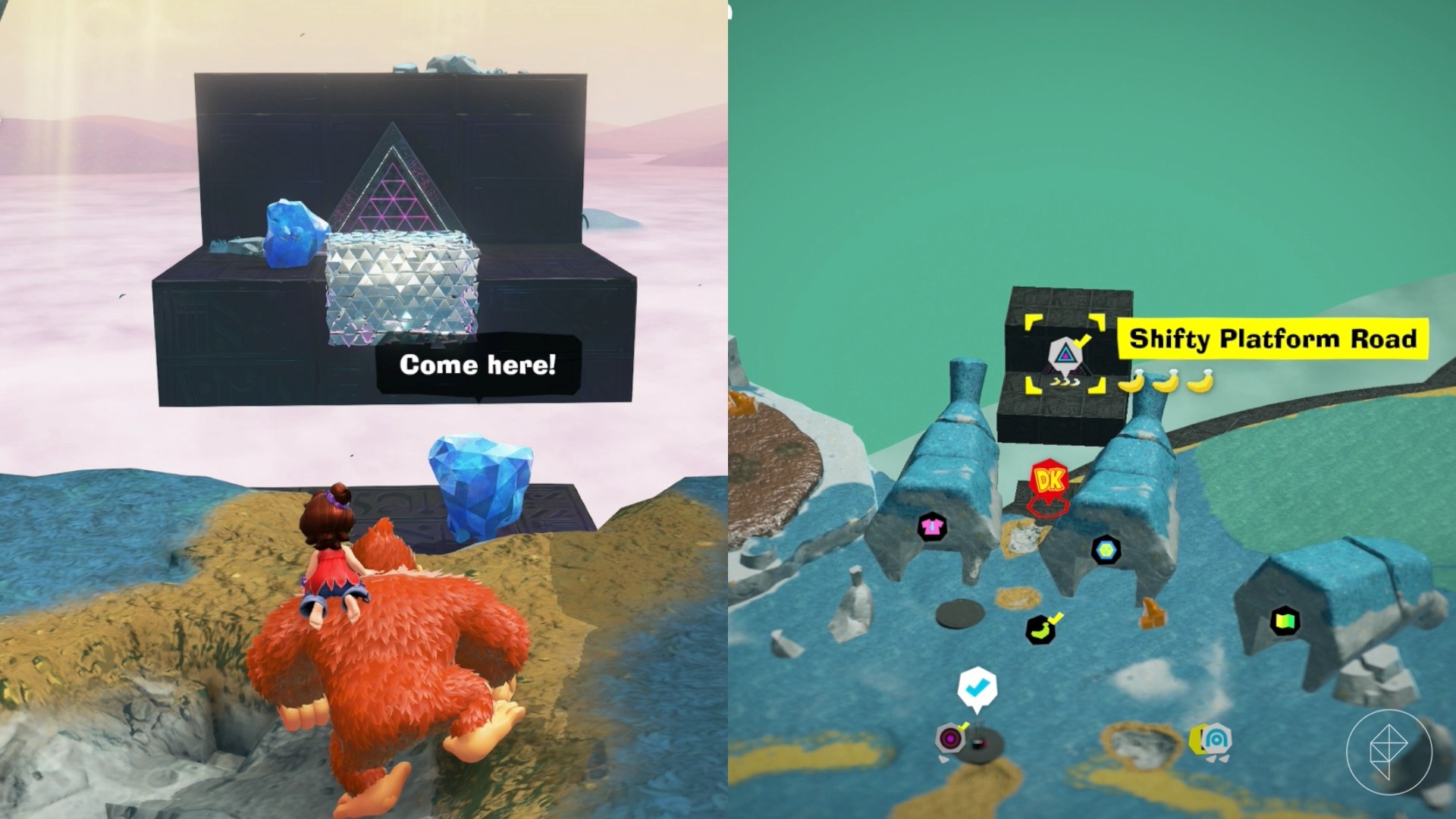 Head to the part of the map that has a stone banana on its side with several concrete bananas jutting out of the ground. Talk to the crystal NPC and it’ll ask you to find its four friends.
