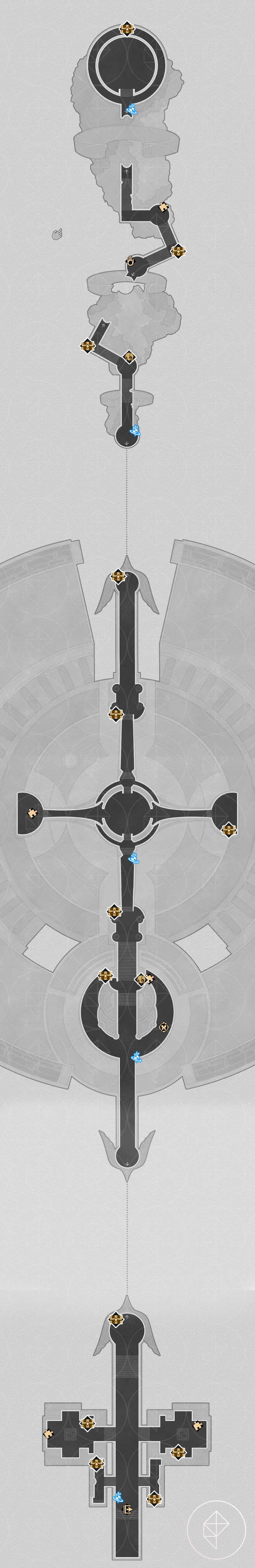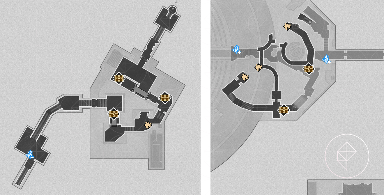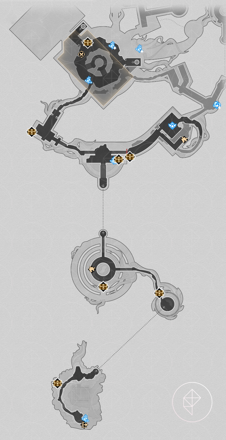 This new area has some unique maps, sprawling over many floors. It does have rooms with 3D maps, though there’s no wall-walking or anything like that. The rooms switch between dawn and evernight, subtly changing the map and making different enemies and chests appeared. For the sake of keeping things clean, we’ve displayed all the chests on one map, though you will have to swap between the two time settings to find them all.