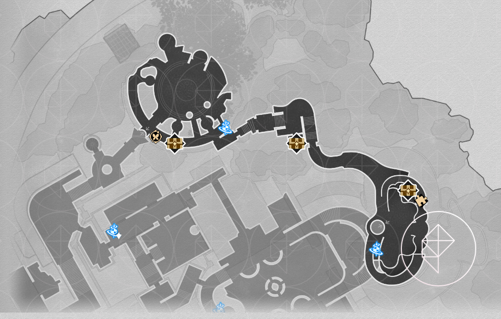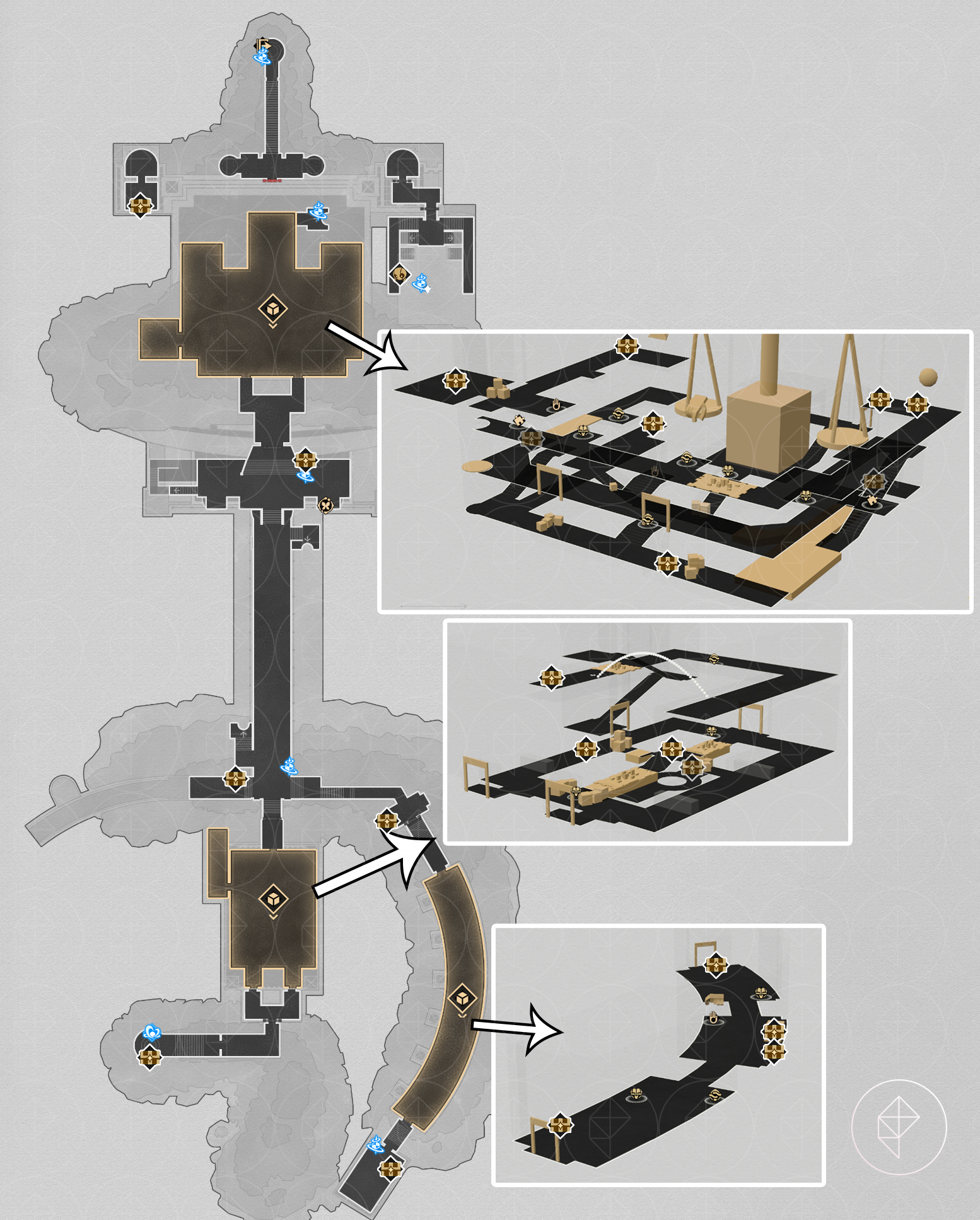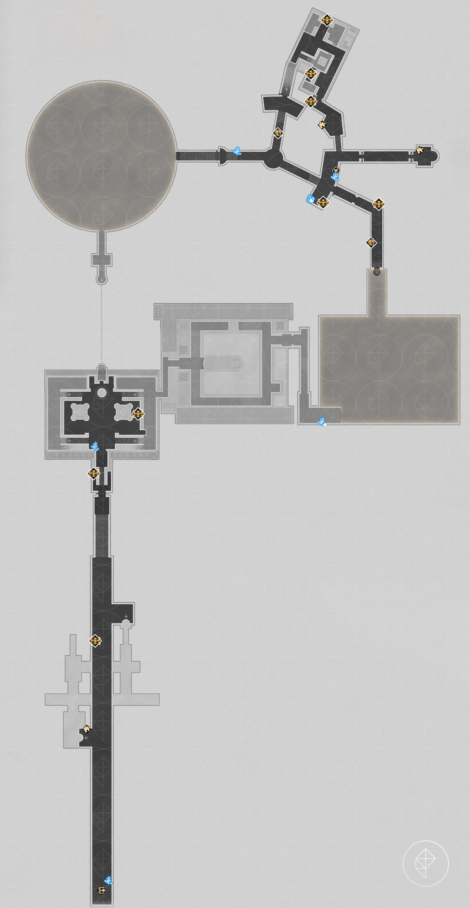 This new area has some unique maps, sprawling over many floors. It does have rooms with 3D maps, though there’s no wall-walking or anything like that. The rooms switch between dawn and evernight, subtly changing the map and making different enemies and chests appeared. For the sake of keeping things clean, we’ve displayed all the chests on one map, though you will have to swap between the two time settings to find them all.