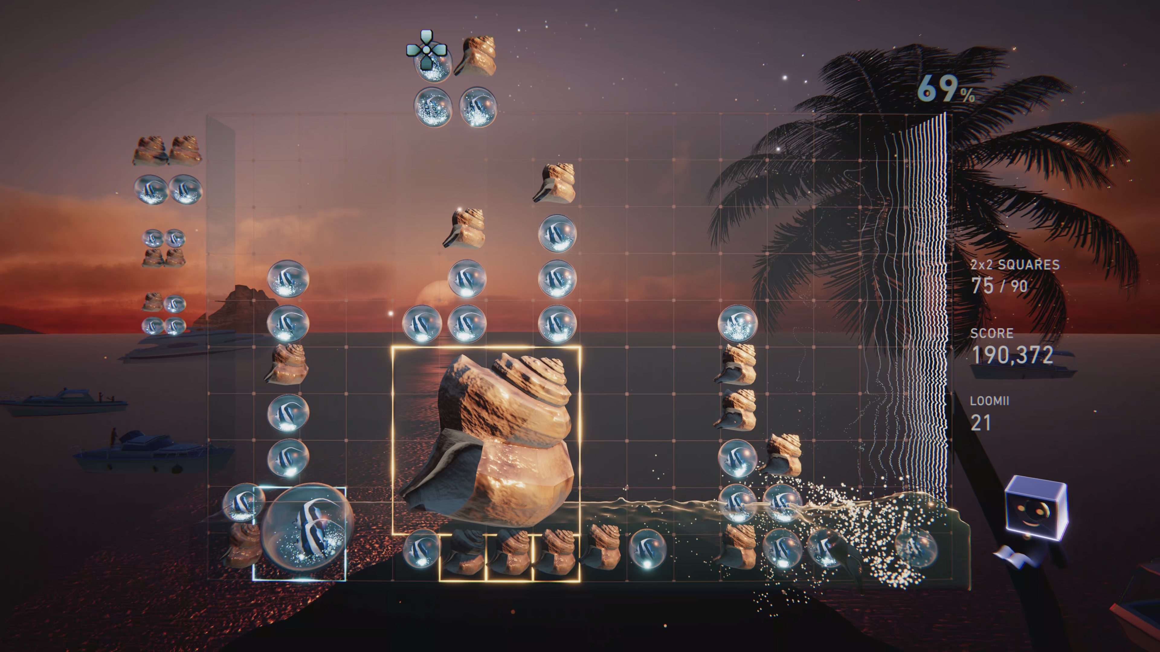 Where Tetris Effect’s visuals were often abstract and introspective, Lumines Arise transports you to real-world environments, including neon-filled city streets (Neon Streets), a peaceful winter landscape (Snowfall), a chaotic nightclub (Mirror Ball), and serene coastal vistas (Island Breeze). Some levels connect you to food so closely you can taste it (yes—Slice & Dice has fruits and vegetables) or creatures you might encounter out in the world, so you can experience their beauty (Goldfish Tango, Seahorse Sway) or fearsome nature (Spider Webs or Serpent Clash).