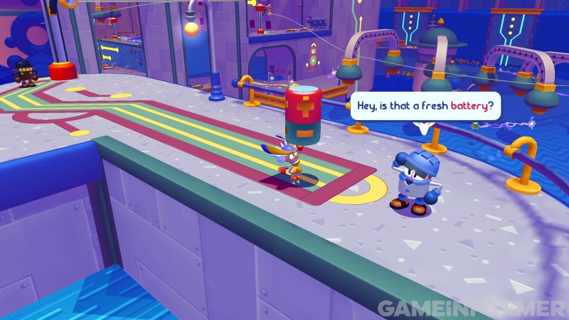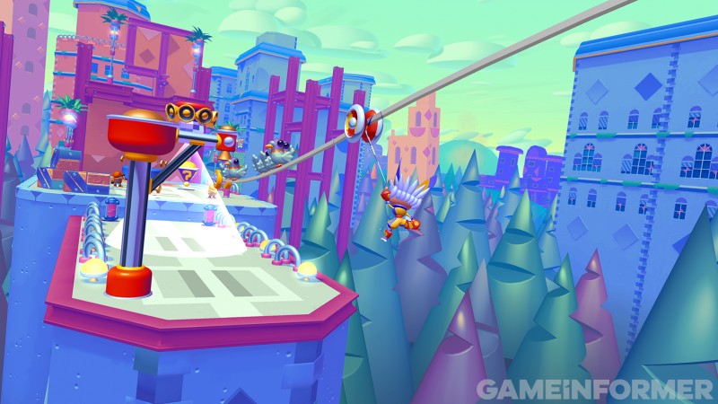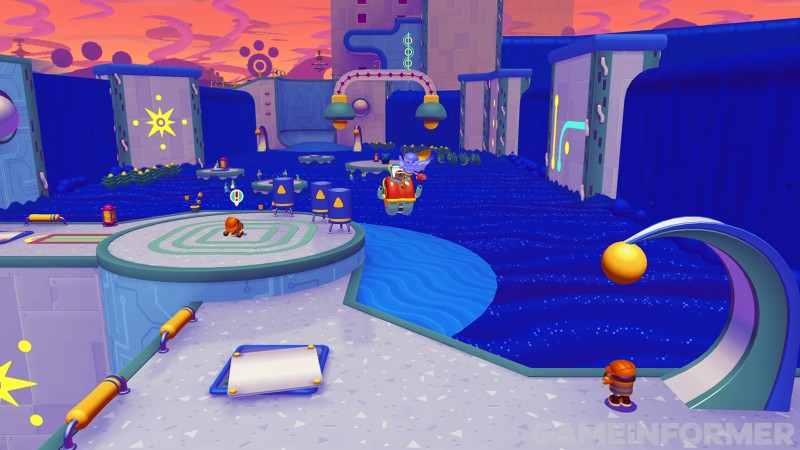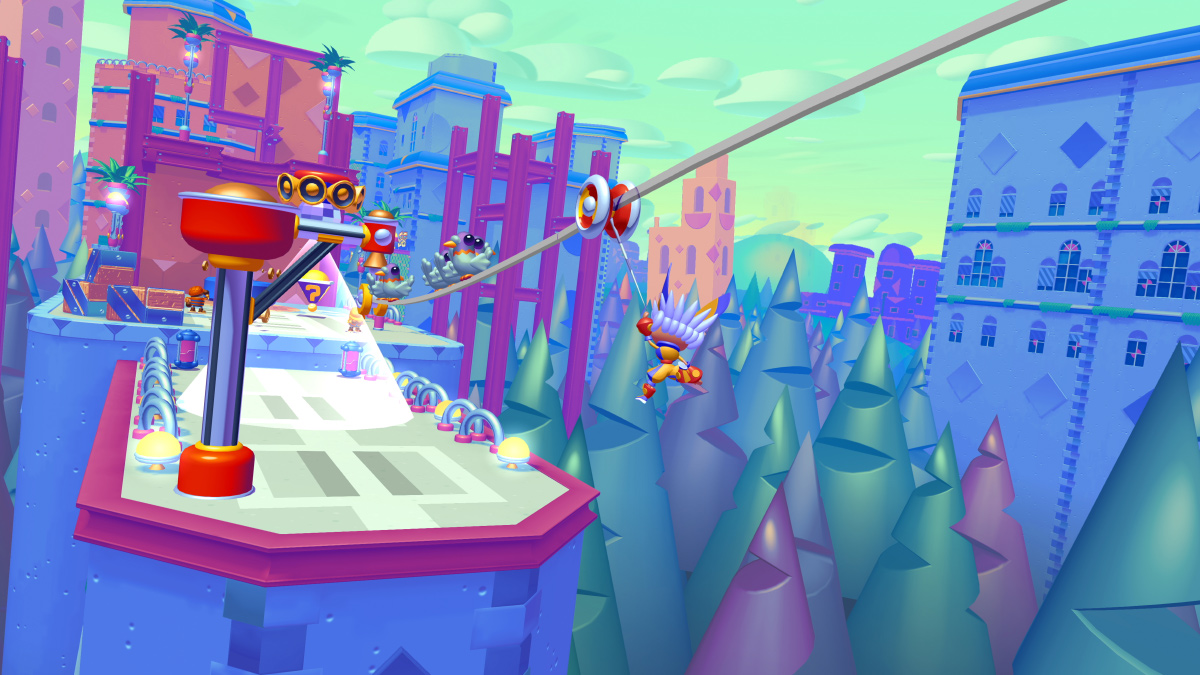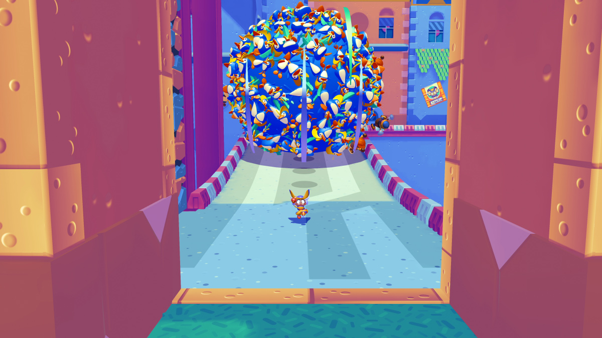 If one aspect of Penny’s Big Breakaway speaks most to its early PlayStation inspiration, it’s the art direction. Inspired by the early 20th Century Triadisches Ballett and the Germanic Bauhaus art movement from the same period, combining colorful abstract ideas with primitive geometry, the world of Macaroon feels like one big performance. Your social status is defined by the performance you can give to denizens of the world. Every stage ends with a “Busker” bonus that requires quick and accurate QTE sequence completion to add additional points to your total score. Within each stage are three denizen challenges, like collecting four missing tax forms for an electric company while riding Penny’s yo-yo like a unicycle, and during the Busker bonus, the denizens you help watch you perform.