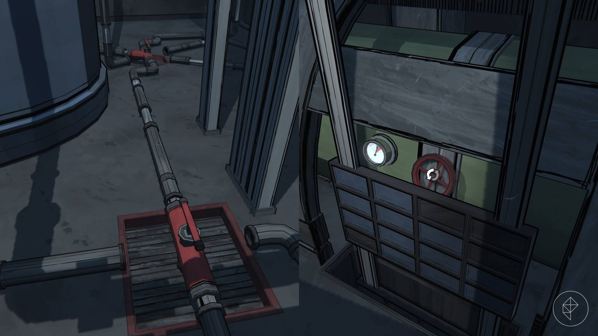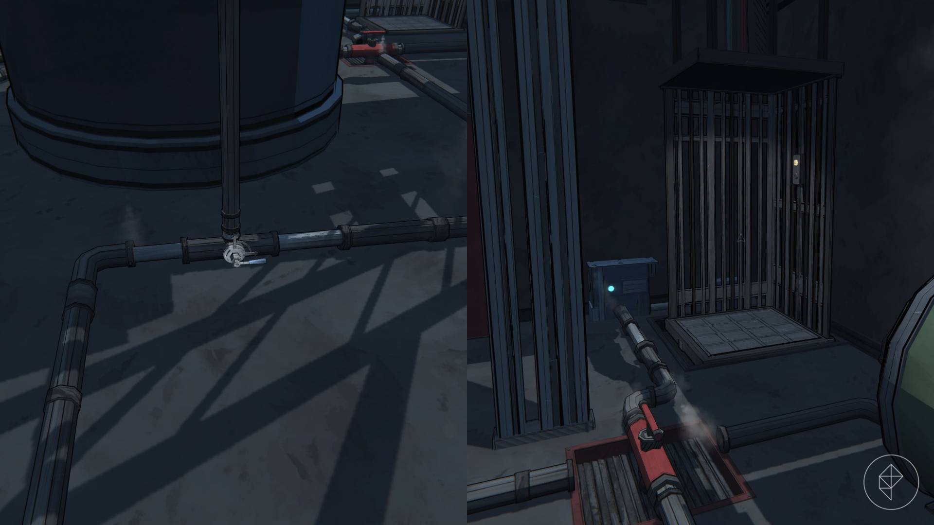To redirect steam to the control panel, you’ll need to rotate the red pipes and small blue hand lever so that steam is directed from the tanks to the center of the room. Once the steam has been rerouted, walk up the stairs and along the pathways to the control panel.