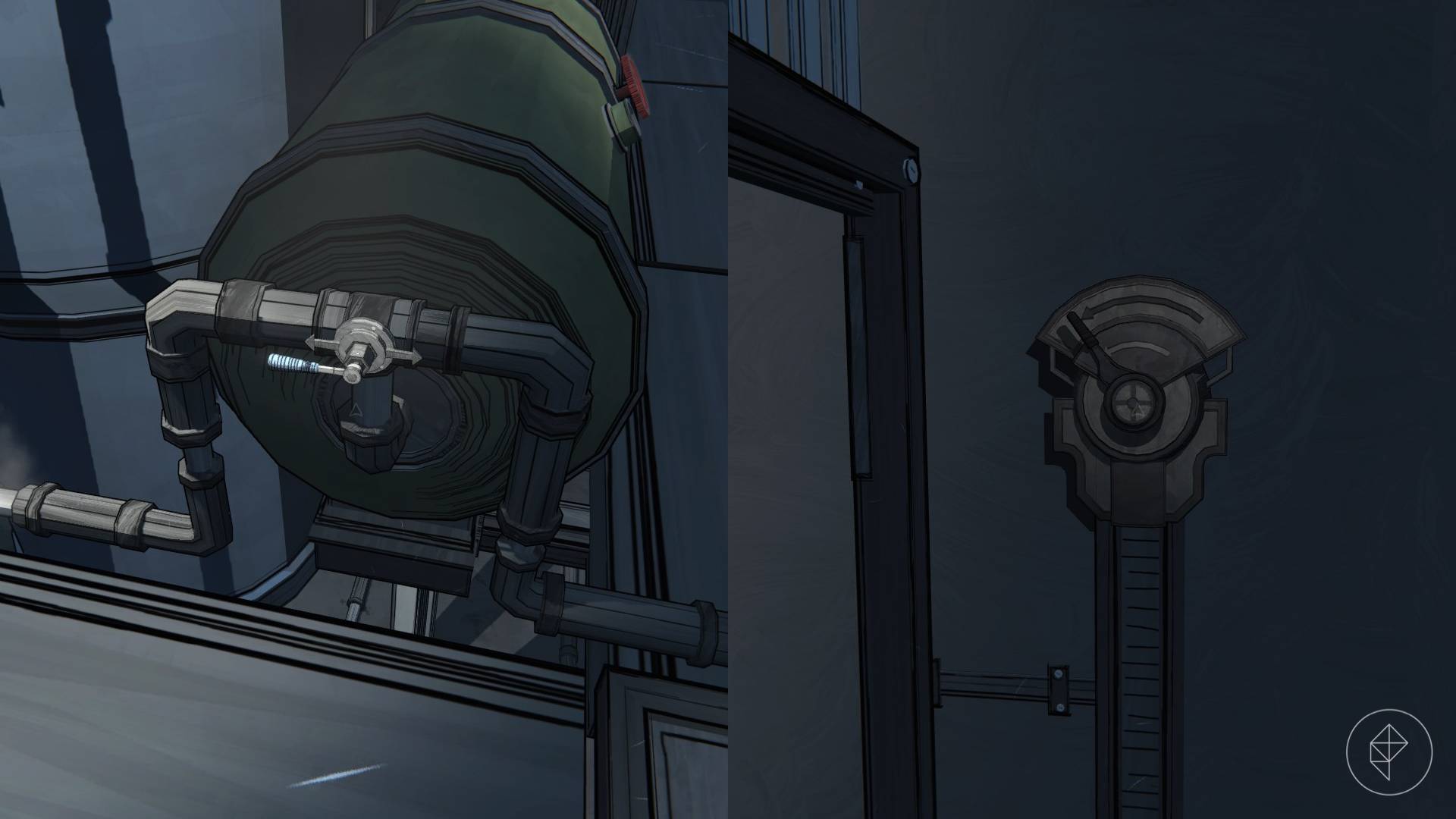 Turn the valve on the green tank and redirect the small blue hand lever on its connecting pipe towards the left. At the end of the walkway, turn the lever to the left to lift and unlock the barred door. Next, ride the elevator back down to the lower floor to redirect steam to the control panel.