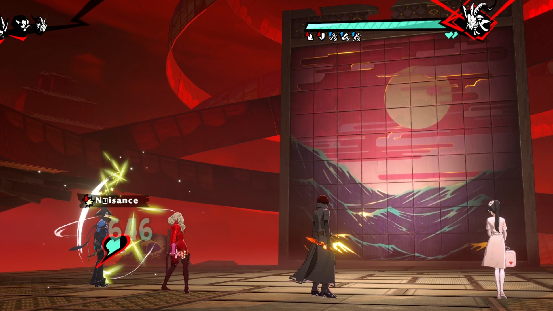 In phase four, Miyazawa will apply the Nuisance debuff to one of your characters and retreat into the wall behind him. With your healthiest or curse-resistant character, remove the Nuisance debuff through a Persona skill or either the Relax Gel or Alert Capsule items, or else the character afflicted with Nuisance will start to attack the other party members. With your other party members, use guard to lower the damage of the upcoming attack.