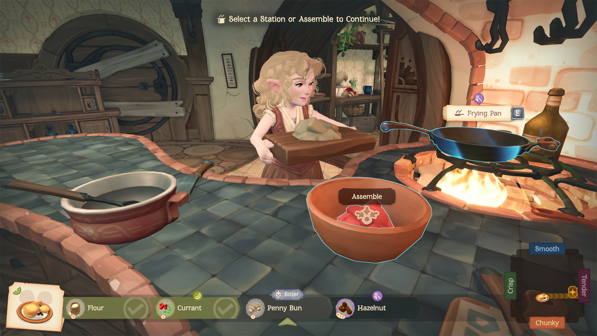 As you unlock more cooking stations, you’ll get more opportunities to adjust the ingredients’ flavor. Beware that you may be able to use more than one cooking station per ingredient. In the example below, the penny bun has already been chopped and may be added to the bowl, but as you can see, the frying pan on the right is also highlighted in blue — since the deliciousness star requires more tenderness, it would be best to fry the penny bun first.