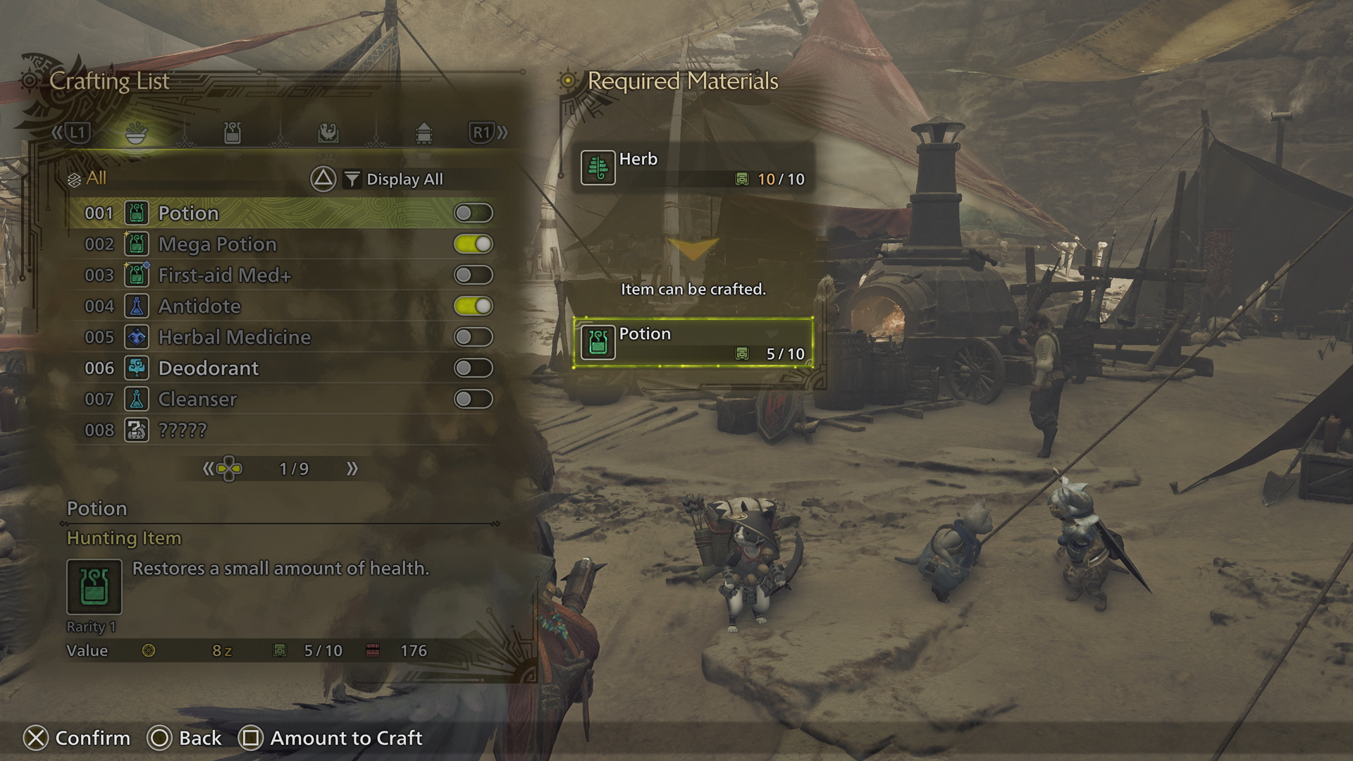 The previous steps apply to crafting other healing items, like mega potions and First-Aid Med+ as well. You just need different materials to craft each item. In addition to crafting, you also purchase potions from the Provisions Stockpile at any base camp for 66z each.
