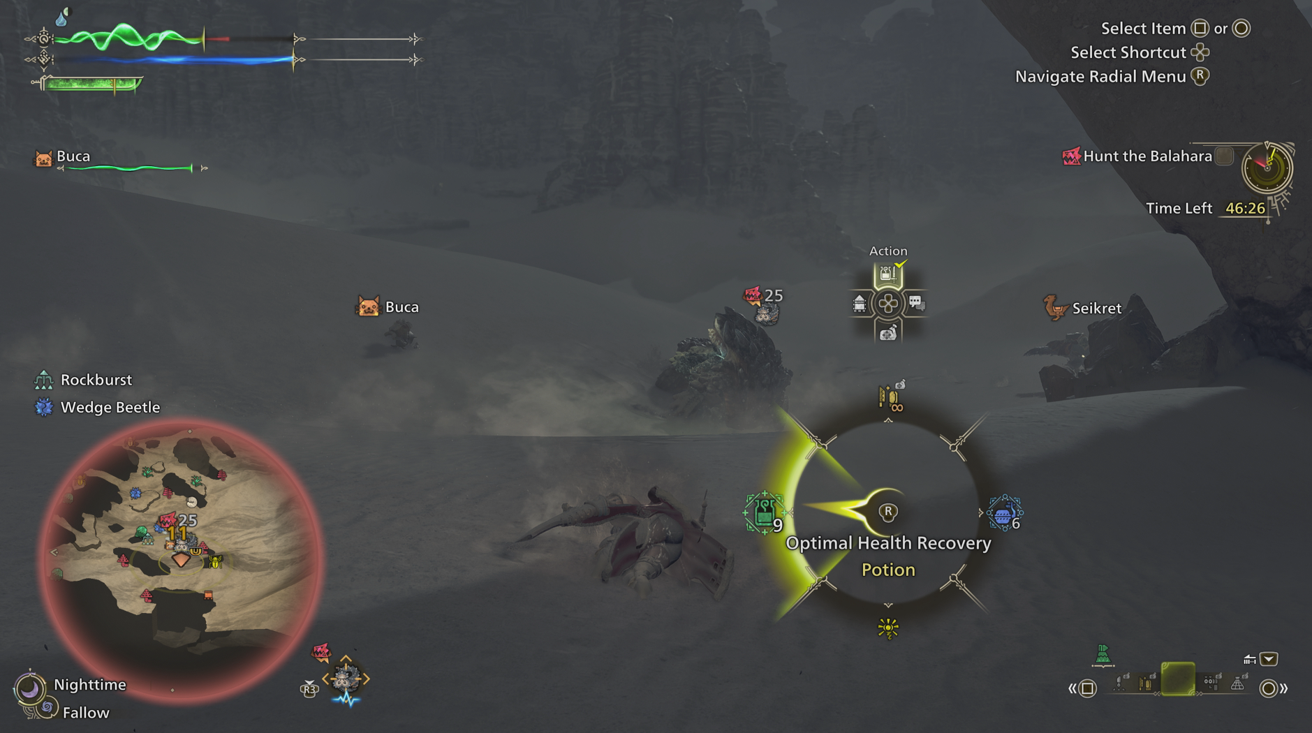 The “Optimal Heal” option on the radial menu appears to use the healing item that best corresponds with the amount of damage you need to heal. (Polygon tried to test this, but it ended up using regular potions each time, so we couldn’t verify which conditions prompted the use of which items.)