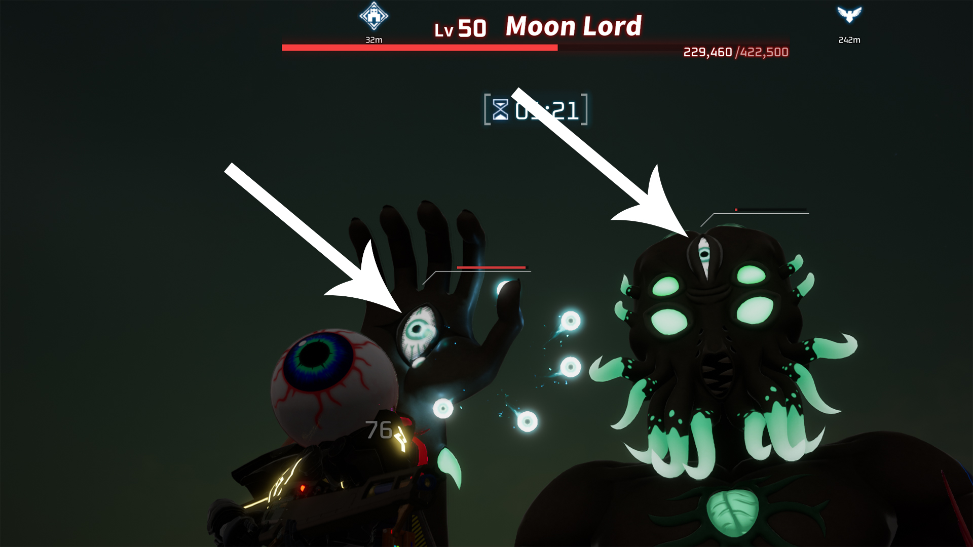 Since the Moon Lord is a Raid Boss, he cannot be captured (sorry!). The Moon Lord has three weak points in the form of large eyes: one is placed on his forehead, and the other two are on the palms of his hands (see picture below). Beware that you can’t damage the eyes when they’re closed. As they’re constantly blinking, be ready to fire as soon as they open. Once the eyes are destroyed, the Moon Lord’s heart will be exposed through the opening in his chest. Hit the heart, and the Moon Lord shall be defeated.