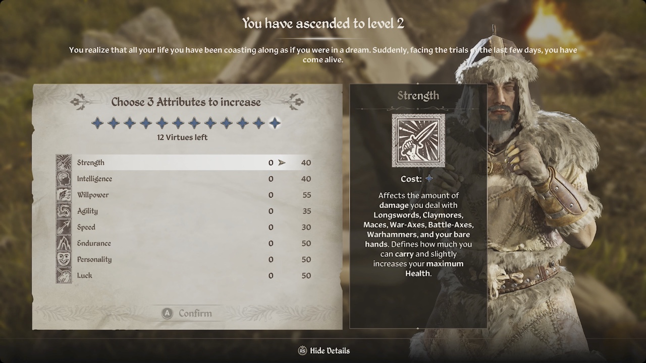 Each time you gain a level, you’ll get 12 Virtues — think of these as attribute points — to assign to three of your attributes. You can raise any attributes by up to 5 per level (meaning you have to spread them across at least three attributes).
