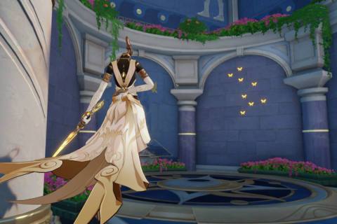 Well, she’s right. They are indeed showing a hidden message and it correlates to the ritual prayer fountains scattered around Okhema. To explain it quickly, the butterflies on the walls mark out the various fountains around Okhema. The symbols that appear at the bottom of the middle wall show what symbol you need to activate in that specific fountain. (A butterfly on the wall will blink as the symbols appear, indicating which one needs which symbol.)