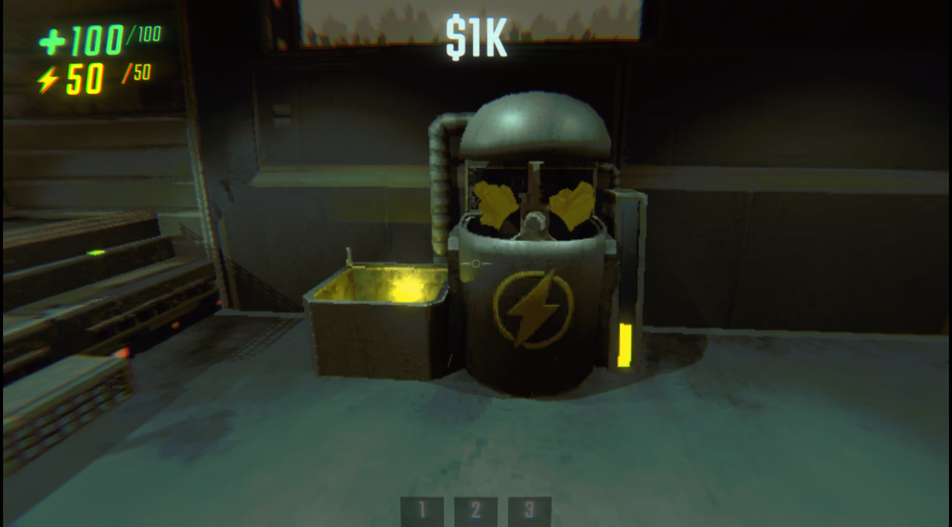 To recharge your weapon or tool, just put it in the square-shaped bin next to the machine. You can see how much juice your recharge machine has by looking at the yellow bar on the right side. You’ll see it go down as your item recharges.