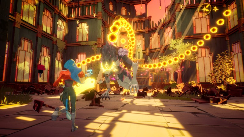 At the end of my playtime, I took on a boss named Dro. The gigantic wolflike creature with a big glowing yellow sword introduced himself by jumping into the arena with strange, staccato animation. It was as if he was intentionally leaving out frames, and it looked awesome. I didn’t get to see much else of him, though, because he killed me almost immediately. After leaping over a few expanding yellow attack circles on the ground, I got in about two hits before losing all my health. Preston was still polite about my run but did not offer the same compliment about how long I lasted compared to when I was out in the world.