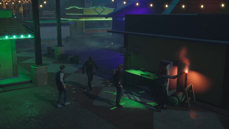 On their own, these typical gameplay mechanics would suffice. It’s what fans would expect from this type of game. What makes Killer Klowns From Outer Space stand out is how well it balances its competing roles, which is initially expressed through their inherent differences. The humans can loot around for weapons, helpful tools (like a compass that shows where a map’s exits are), and health/stamina-based items to gain an edge over their colorful pursuers. Their smaller size allows them to be quicker on their feet, sneak through windows, and hide relatively easily after breaking a Klown’s line of sight. And while taking on a Klown solo using the right weapons is possible, being a part of a larger group allows for more team-oriented tactics during a scuffle.