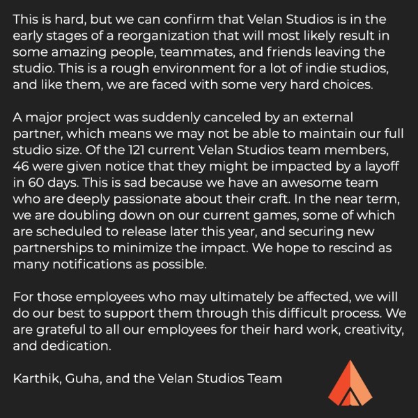 “This is a rough environment for a lot of indie studios, and like them, we are faced with some very hard choices,” Velan writes in the post. Should the worst come, Velan states it will do its best to support affected staff members. You can read the full post below.