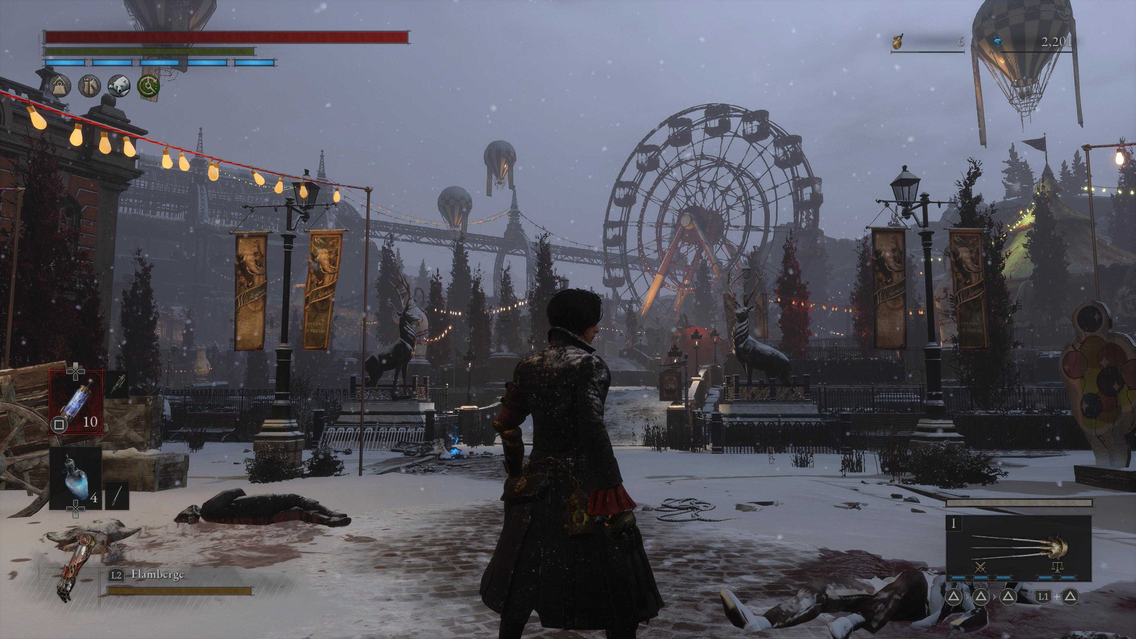 The expansion begins with P exploring the Krat zoo, which is derelict in the present timeline but intact during the prequel. However, it’s certainly not open to visitors — monstrous gorillas and kangaroos stalk its grounds, ready to demolish P. Even though I had beaten the game with a level 94 Pinocchio and fully upgraded weapons, those damn gorillas still bodied me one after the other. The corrupted elephant was also a gnarly and difficult fight, and an early showcase of how difficult the expansion was going to be. If I had accessed the DLC any sooner — it becomes available after you beat chapter nine in the base game — my ass would have gotten even more wrecked.