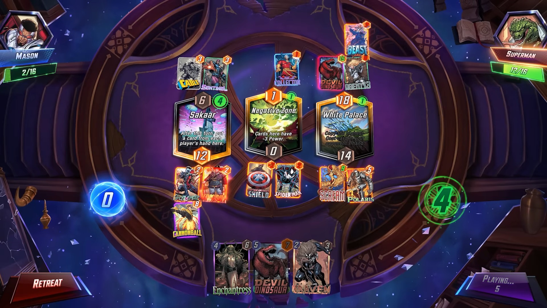 Sanctum Showdown bends and breaks the rules of Marvel Snap, Jones says, by making each round a winning or losing round. In the core mode of Marvel Snap, players are often trying to build toward a big win on turn six, while sometimes fighting for control of certain contested locations, like Asgard or Eternity Range. Like other limited-time game modes in Snap (e.g., High Voltage, Deadpool’s Diner), Sanctum Showdown has its share of banned cards, like Galactus, Storm, and Magik, that run counter to the mode’s design.
