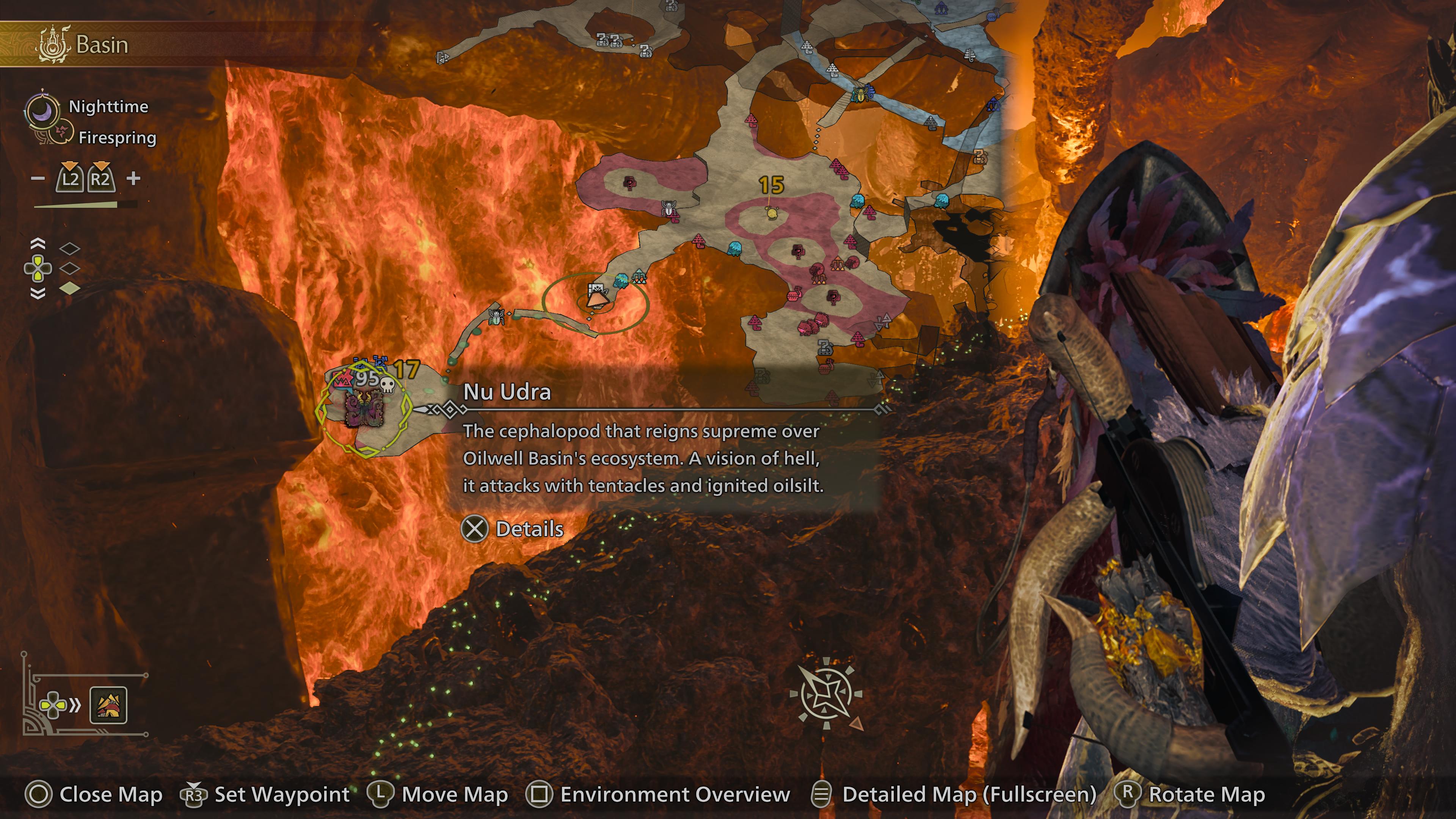 Nu Udra inhabits the Basin biome exclusively, meaning you won’t encounter it elsewhere. Surprisingly enough, Long Forgotten Flame is the only main mission where you have to actually track down your target’s location by looking for tracks. If you’re wondering where to find Nu Udra, the monster is on the underground portion of the Basin biome. The 15 and 14 areas are the most common, but can sometimes be seen in 4 as well. As long as you’re heading toward these spots, you’ll encounter the tracks, which will then point the fireflies to its location, so it shouldn’t take too long.