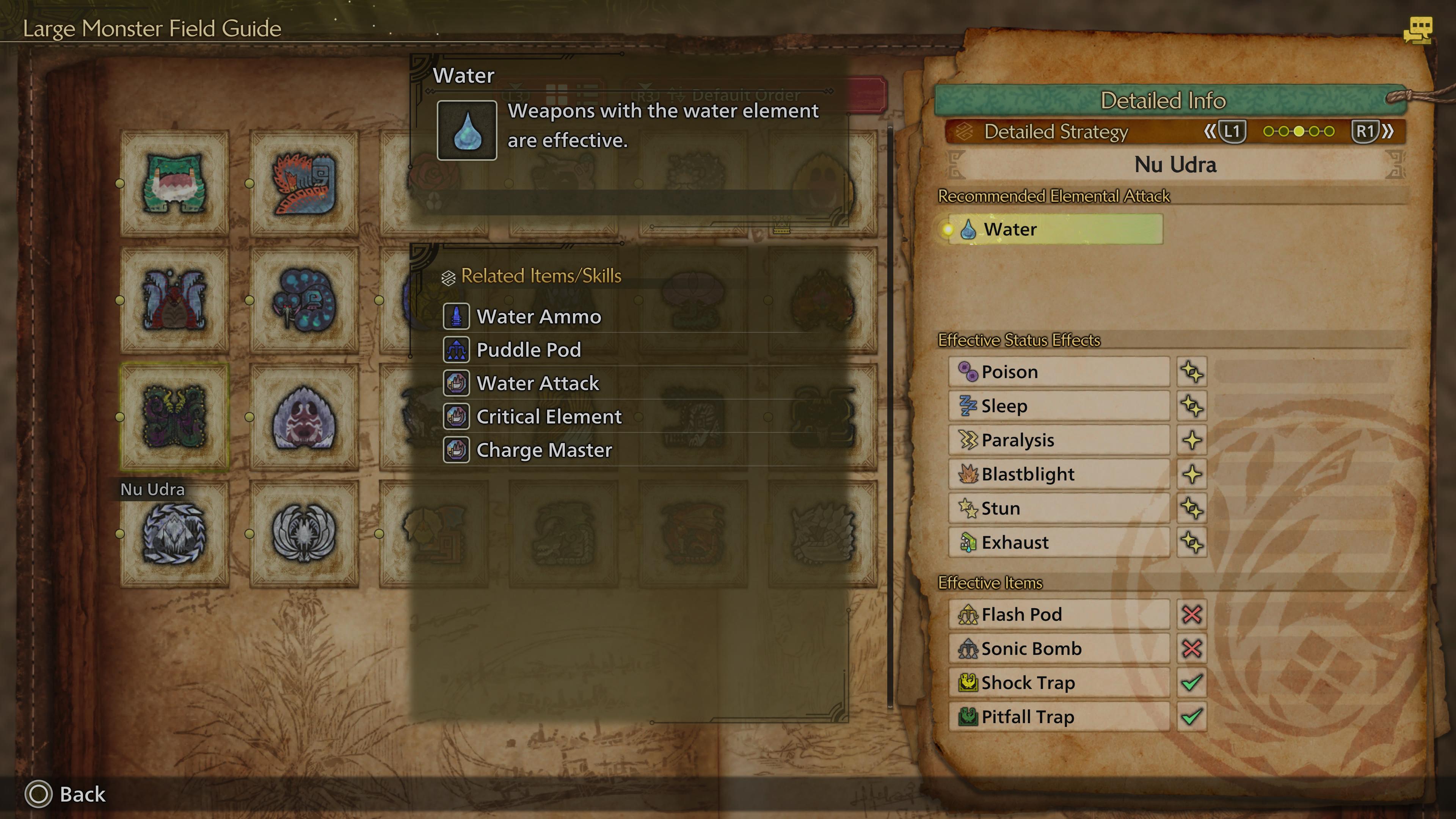 Nu Udra’s recommended elemental attack is Water, which encompasses Water Ammo, Puddle Pod, Water Attack, Critical Element, and Charge Master — in addition to your own weapon’s properties.