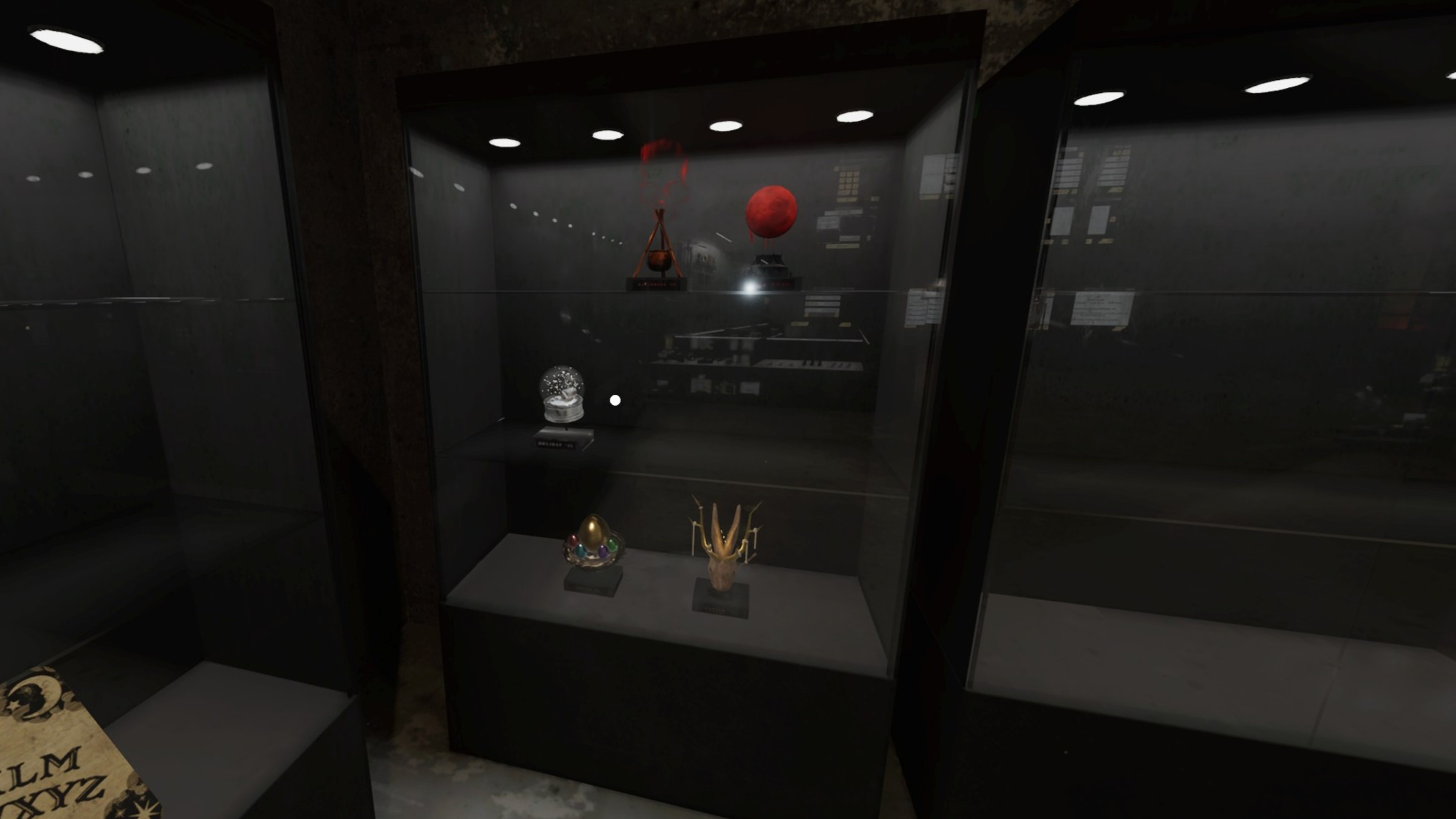 The Phasmophobia in-game trophy cabinet. The cabinet here has several empty slots, with a few trophies filled in for the Blood Moon, Jackalope, and Winter's Jest events.