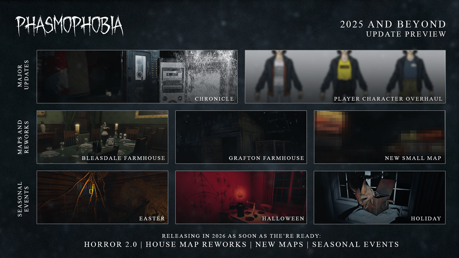 Later in the year, Kinetic also said it would be releasing a brand new map. It will be small, they said, “akin to the houses” that already exist in the game. Additional changes will be made to existing maps. Specifically, the Bleasdale and Grafton Farmhouses will get major updates, overhauling the layout and creating new rooms for ghosts to haunt. There are also teases of holiday updates for Easter and Halloween, and even some 2026 features, including one thing called “Horror 2.0” that certainly piques my interest.