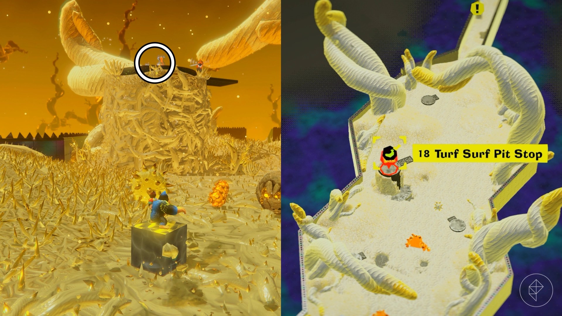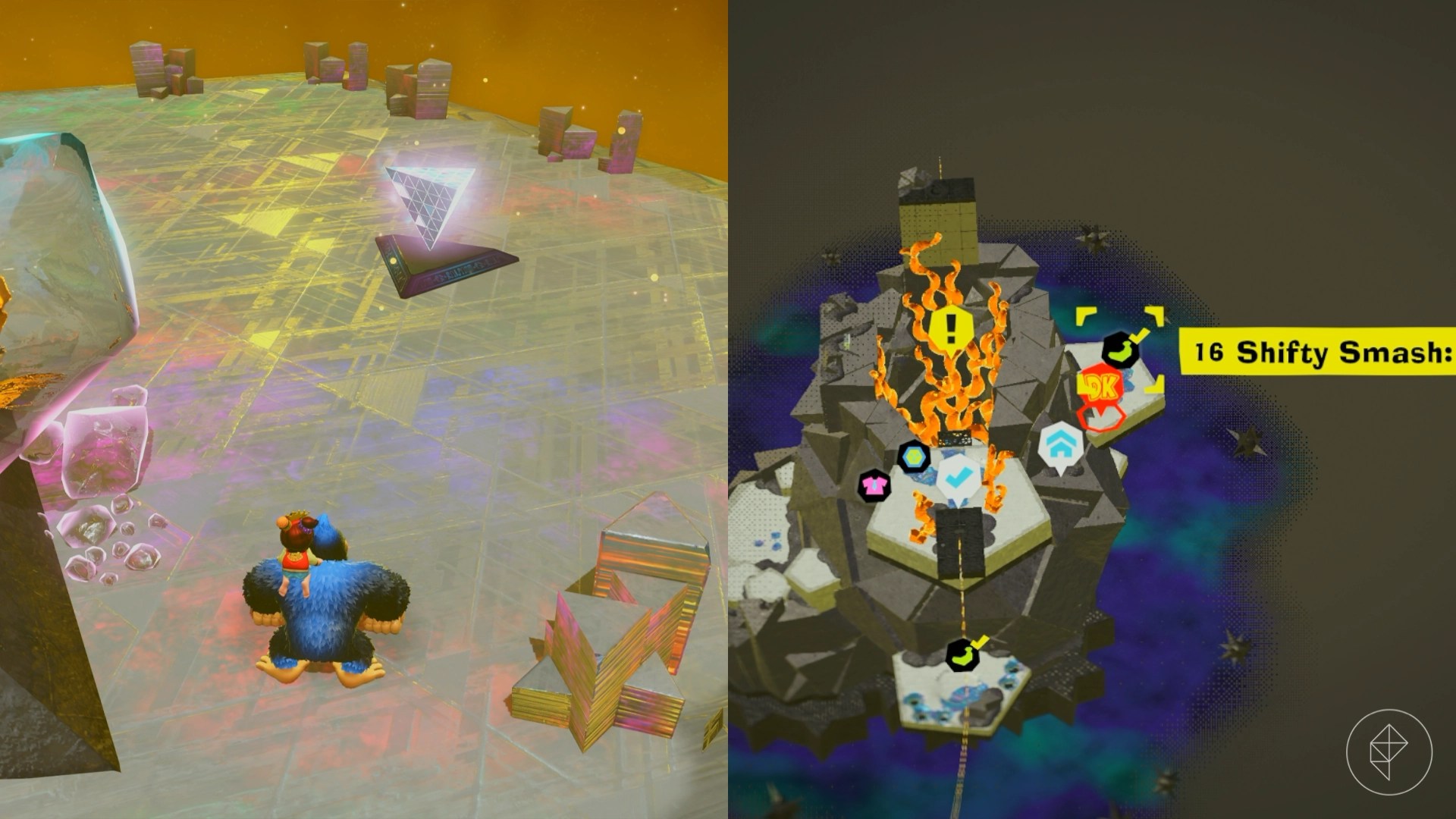 Before you drop down into the hole on Sublayer 1606, climb onto the stone on the right side and look over the edge. You’ll spot a shifty smash challenge on a platform below. Before starting, we recommend transforming into a snake and grabbing a chunk. To complete the challenge, charge jump through the shifty platforms with a chunk in hand all the way to the top.