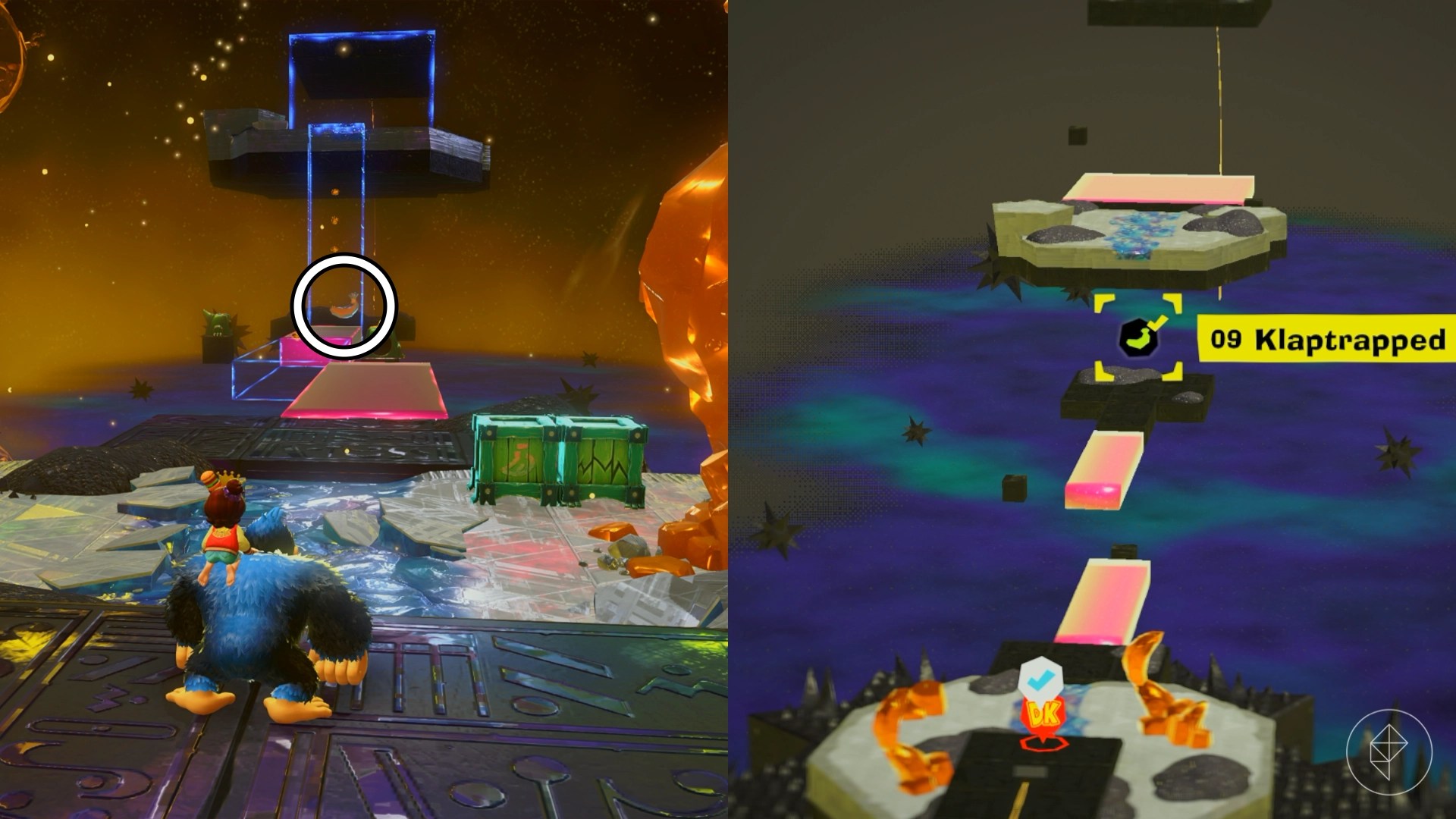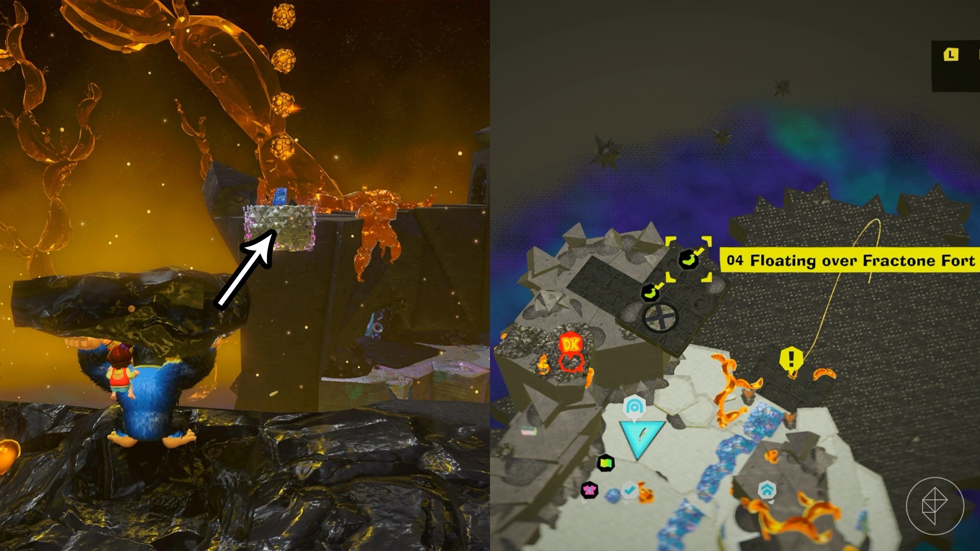 Climb to the top of the cliff behind the Warp Gong at Fractone Fort. If you look towards the center of the fort, you’ll find a floating shifty platform. Throw a chunk at it and fly over as an ostrich. Quickly swap to a snake and charge jump to the barrel that’ll shoot you to a platform with a banana on it.