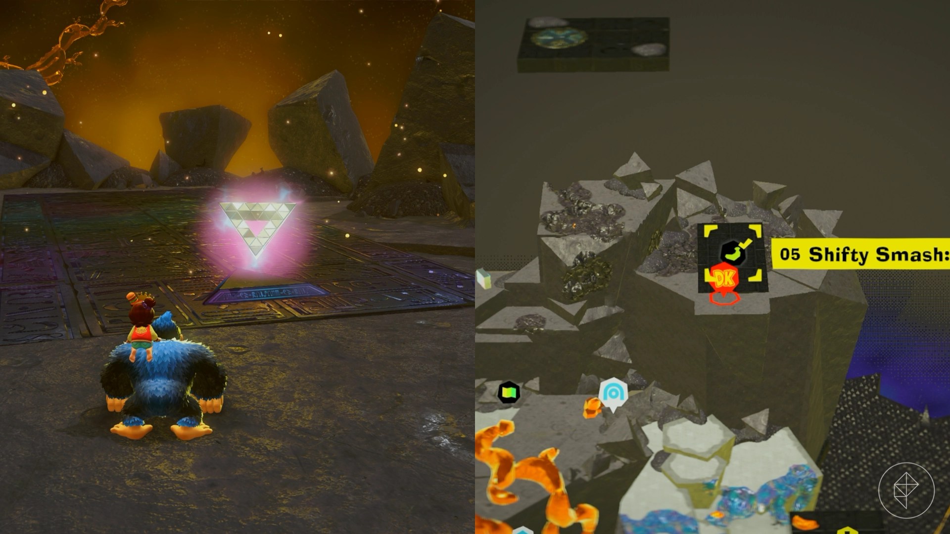 This banana is earned after you complete the Shifty Smash challenge on the cliff above the Warp Gong. To complete it, turn into an elephant and suck up all of the lava. Then, swap to Kong Bananza and smash through the concrete and shifty wall.