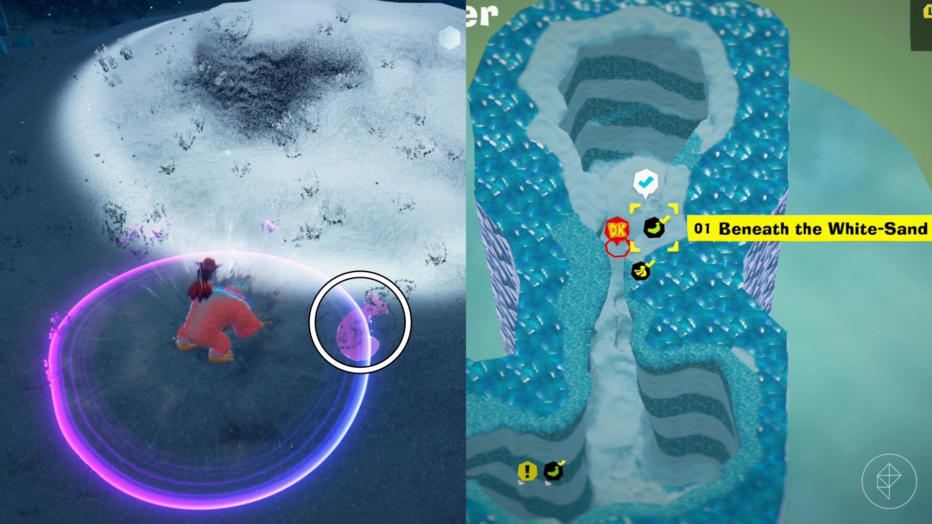 After you drop into the dune below the starting point, climb up the snowy path into the hole in the wall to find this banana.