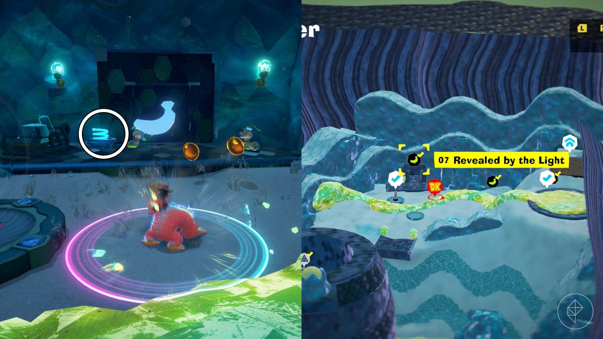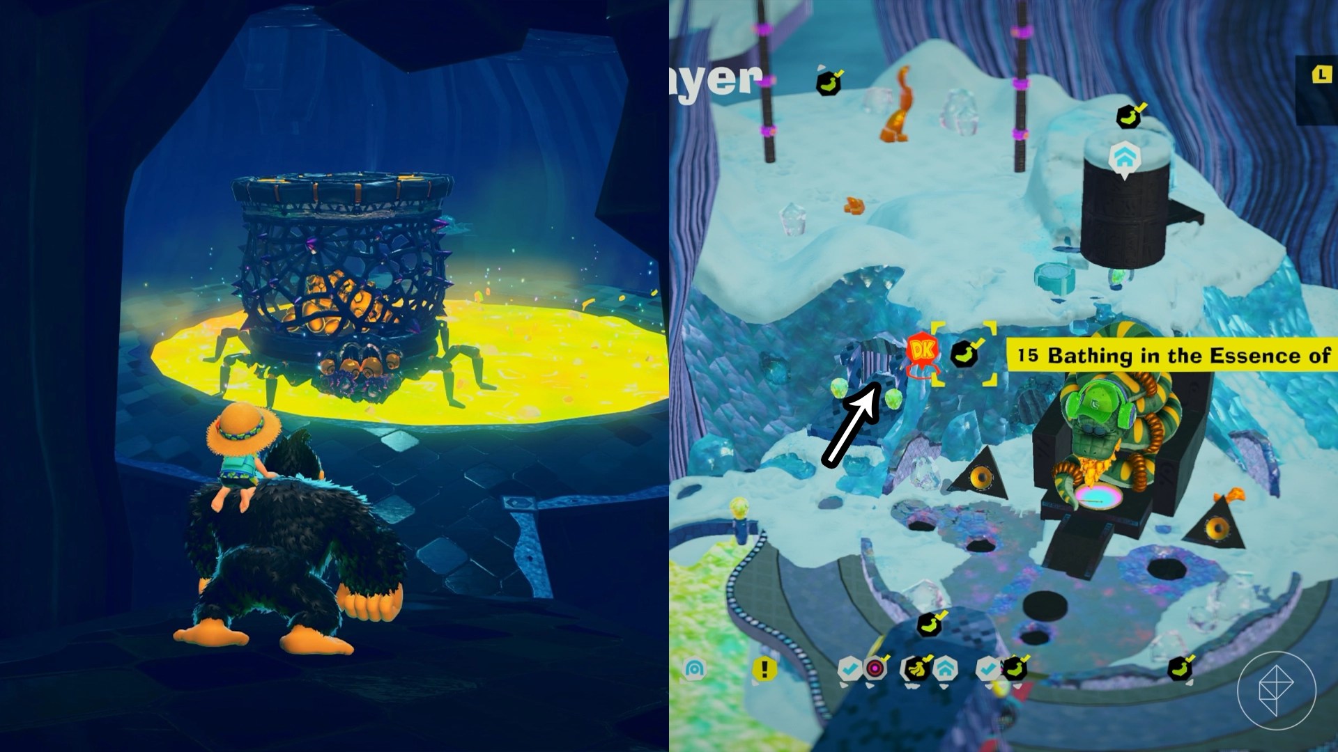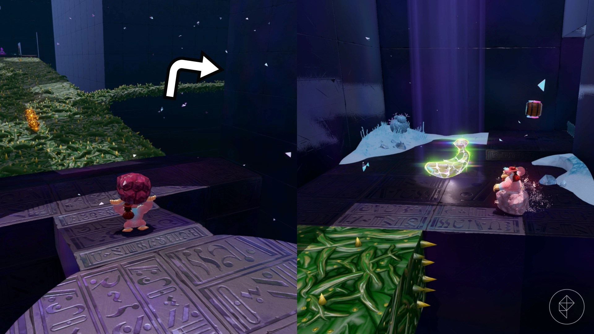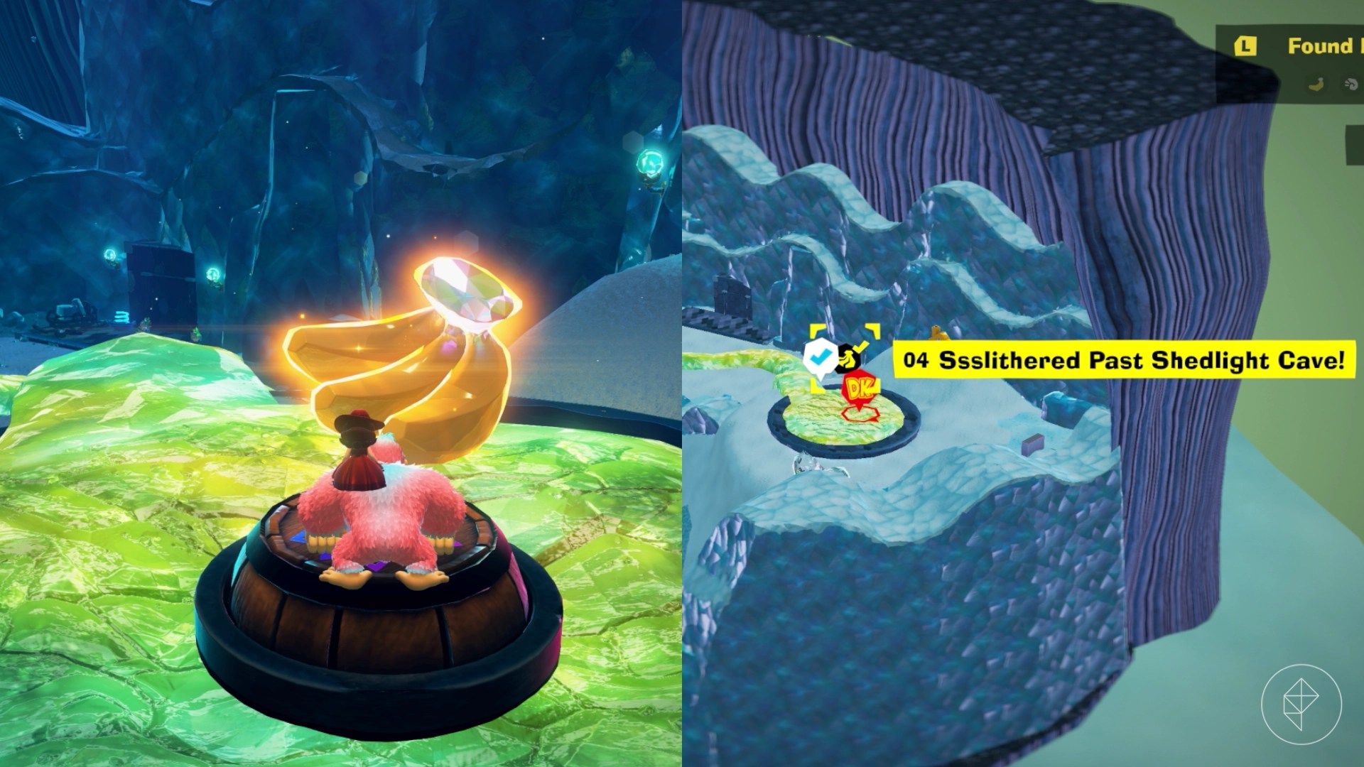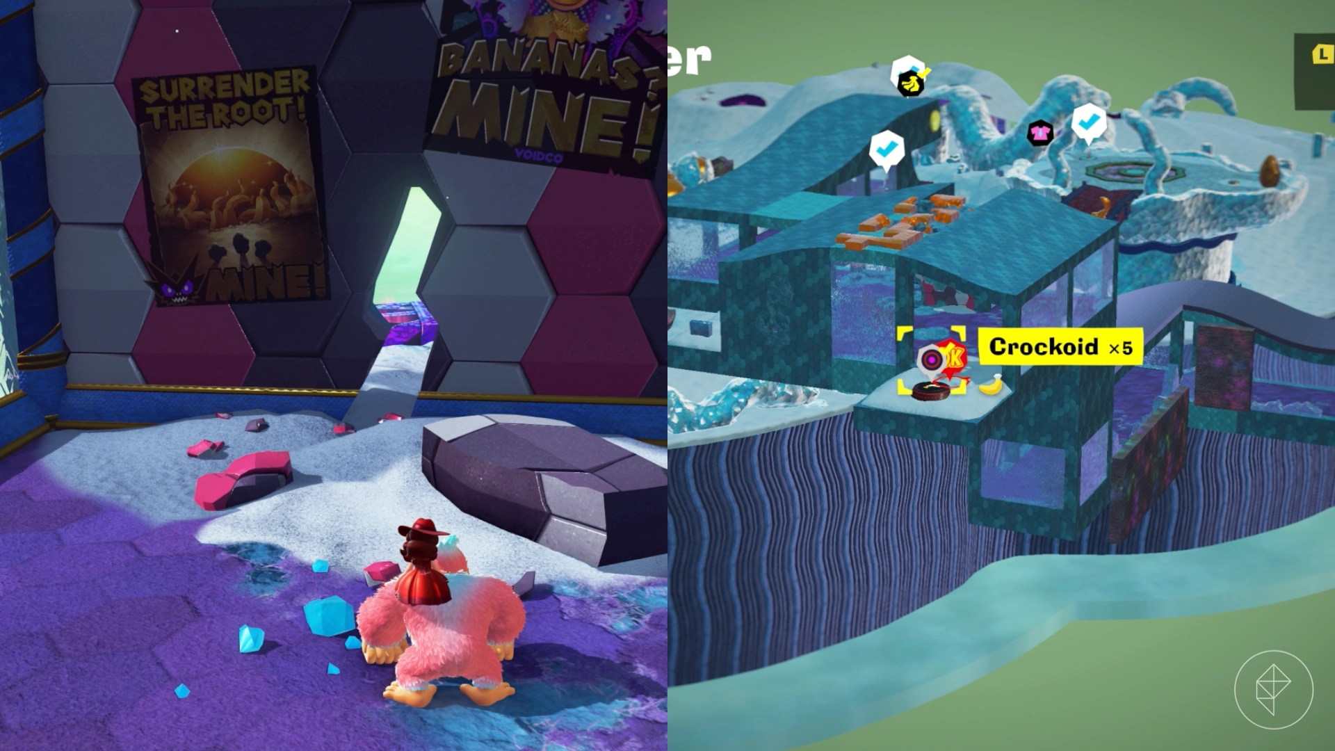Break open the cracked wall to find and complete this combat challenge for your banana. You’ll need to defeat five crockoids that have to be exposed to light first to win.