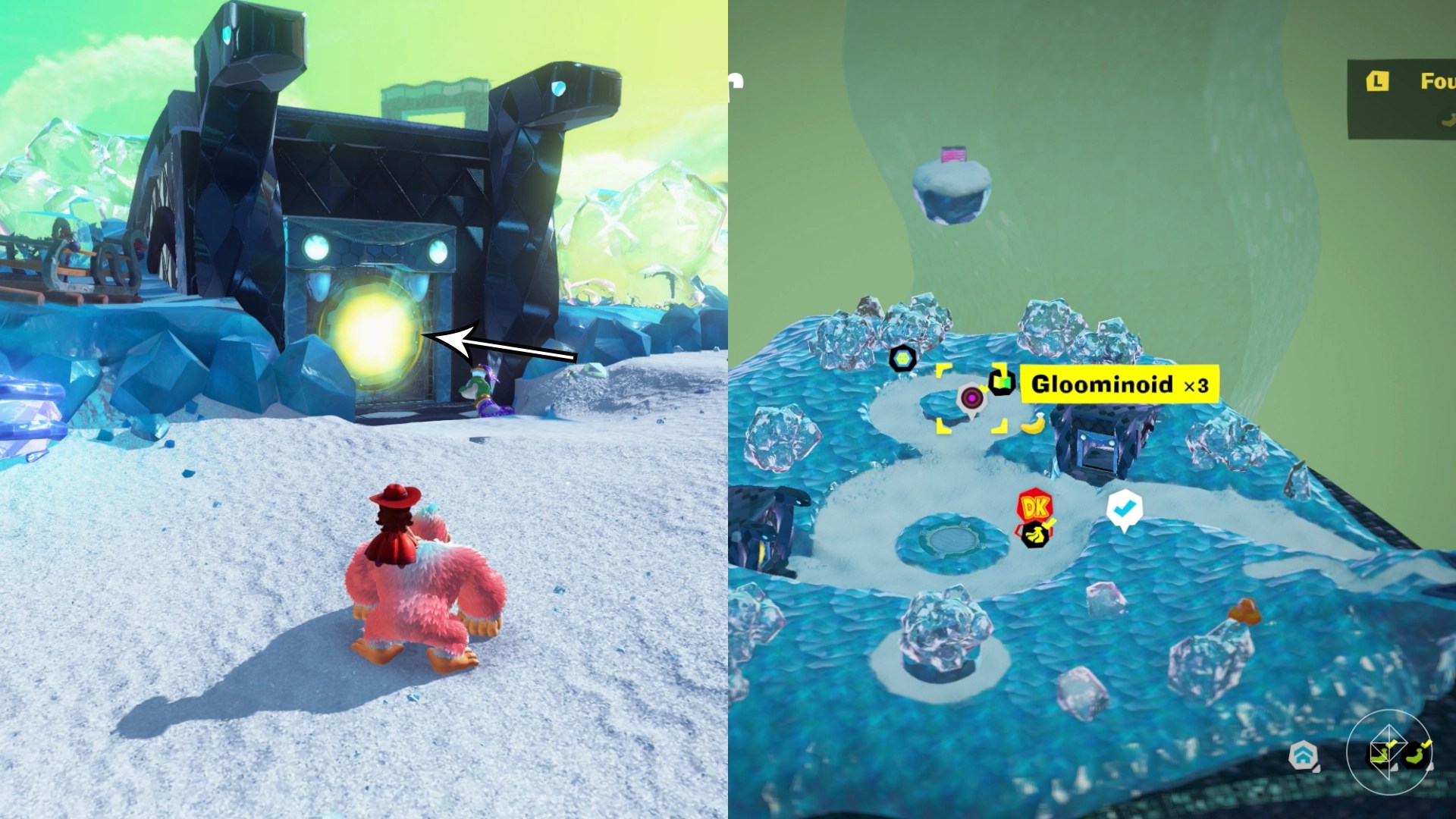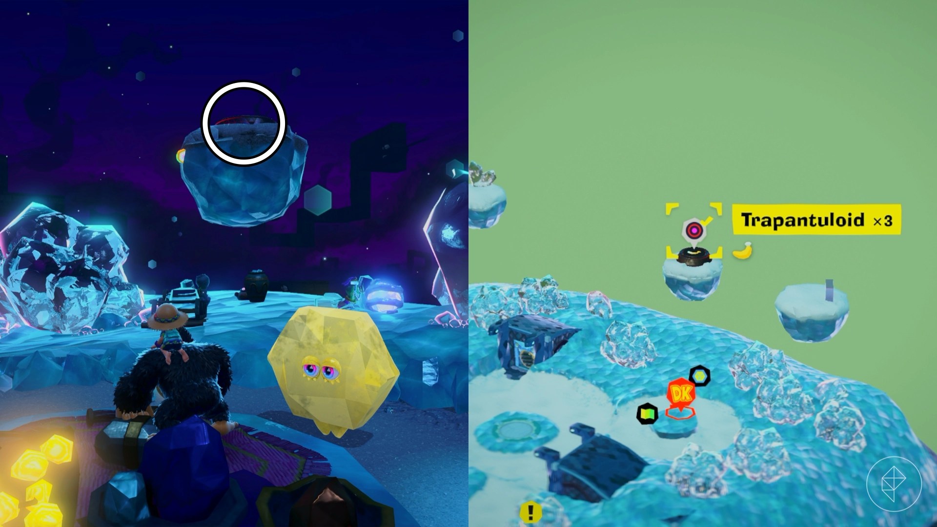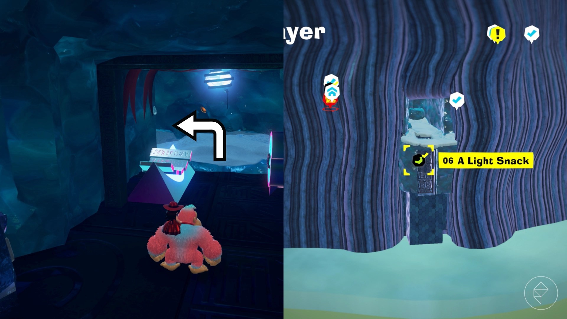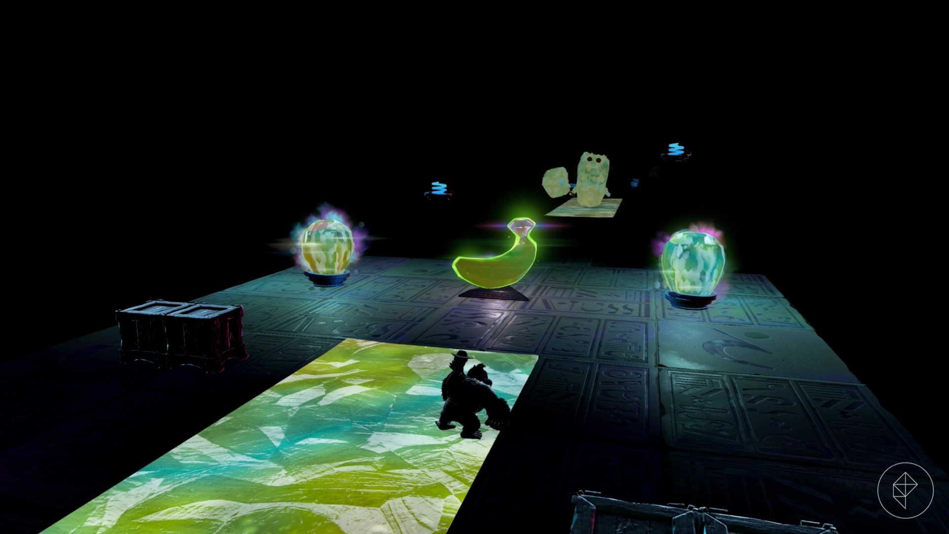 Break open the cracked wall to find and complete this combat challenge for your banana. You’ll need to defeat five crockoids that have to be exposed to light first to win.