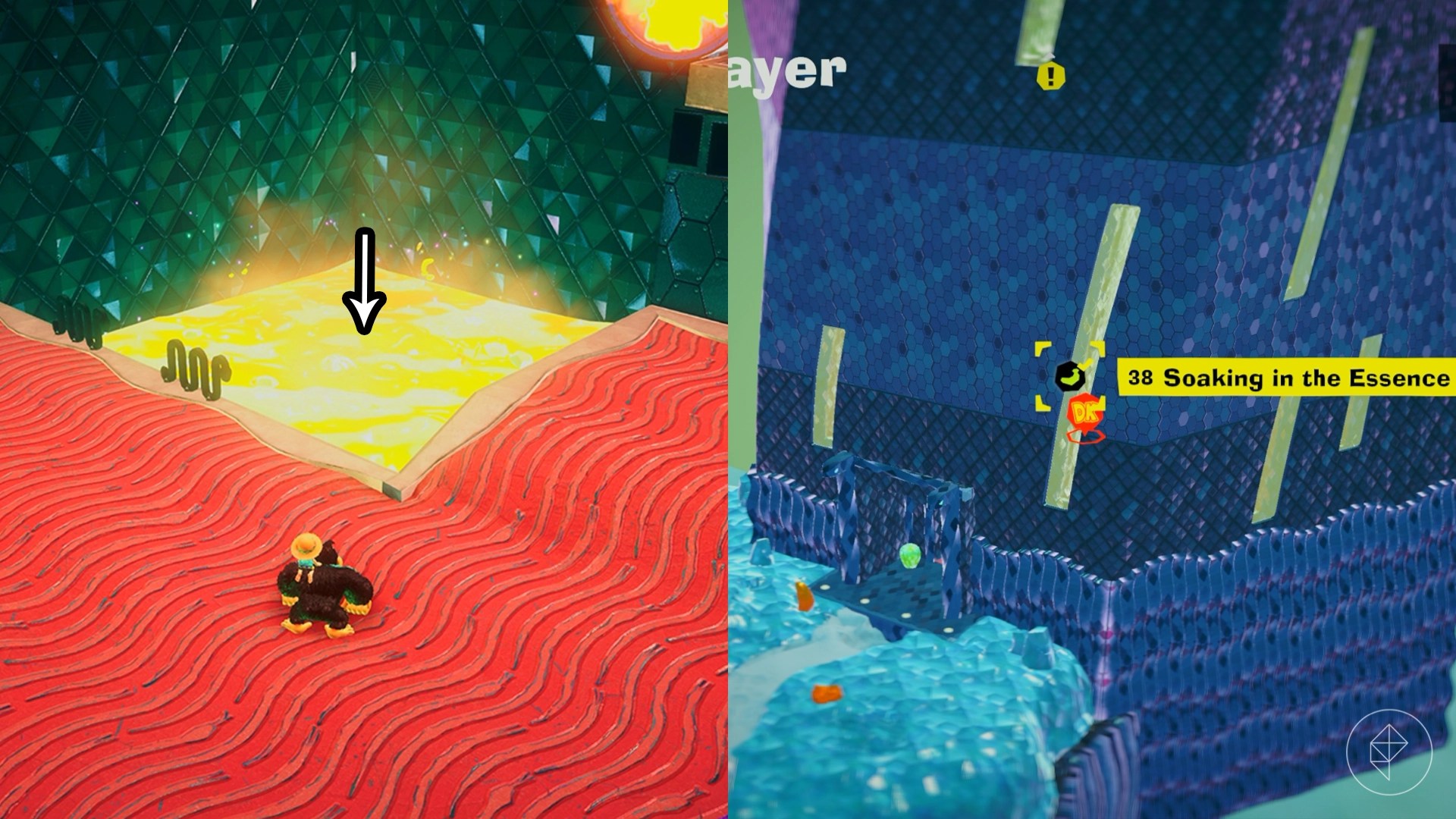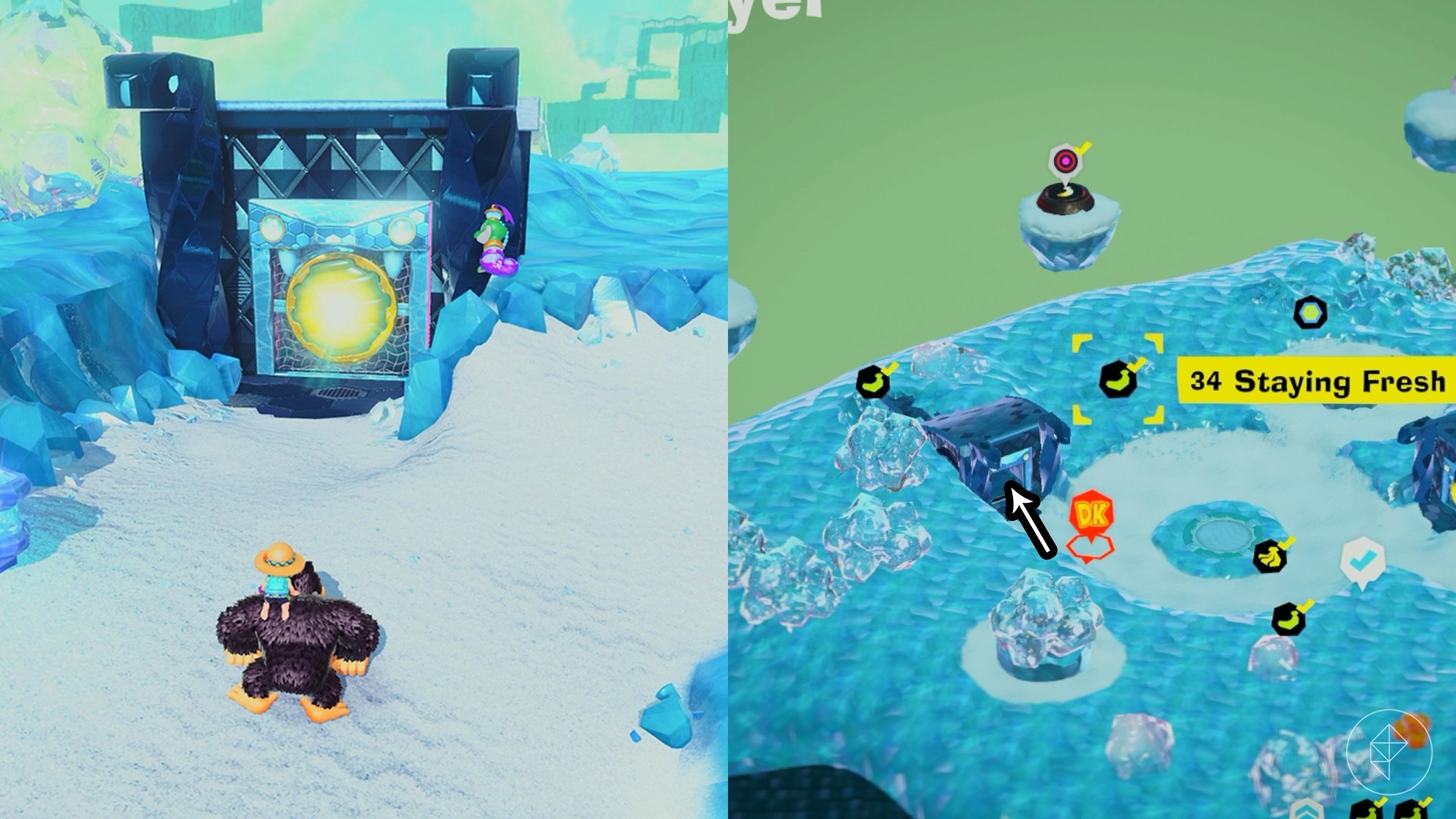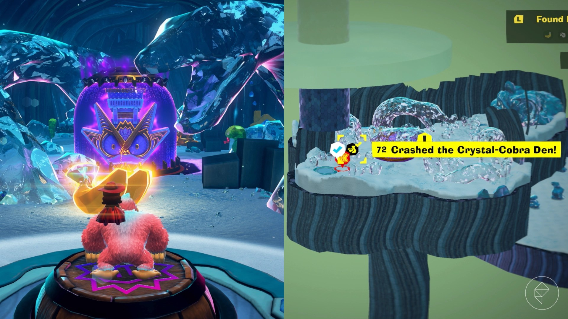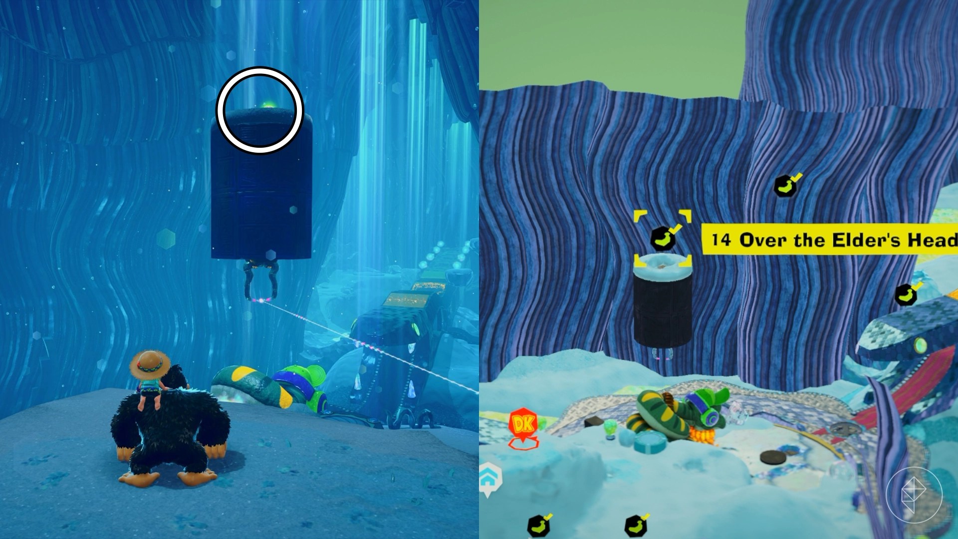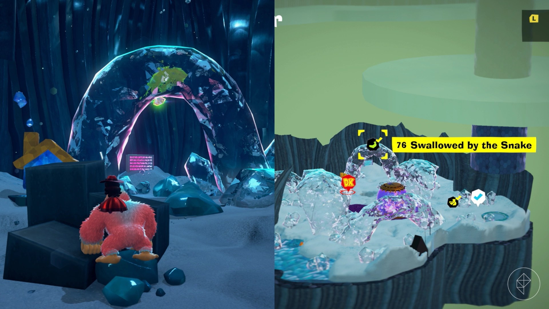 Break open the cracked wall to find and complete this combat challenge for your banana. You’ll need to defeat five crockoids that have to be exposed to light first to win.