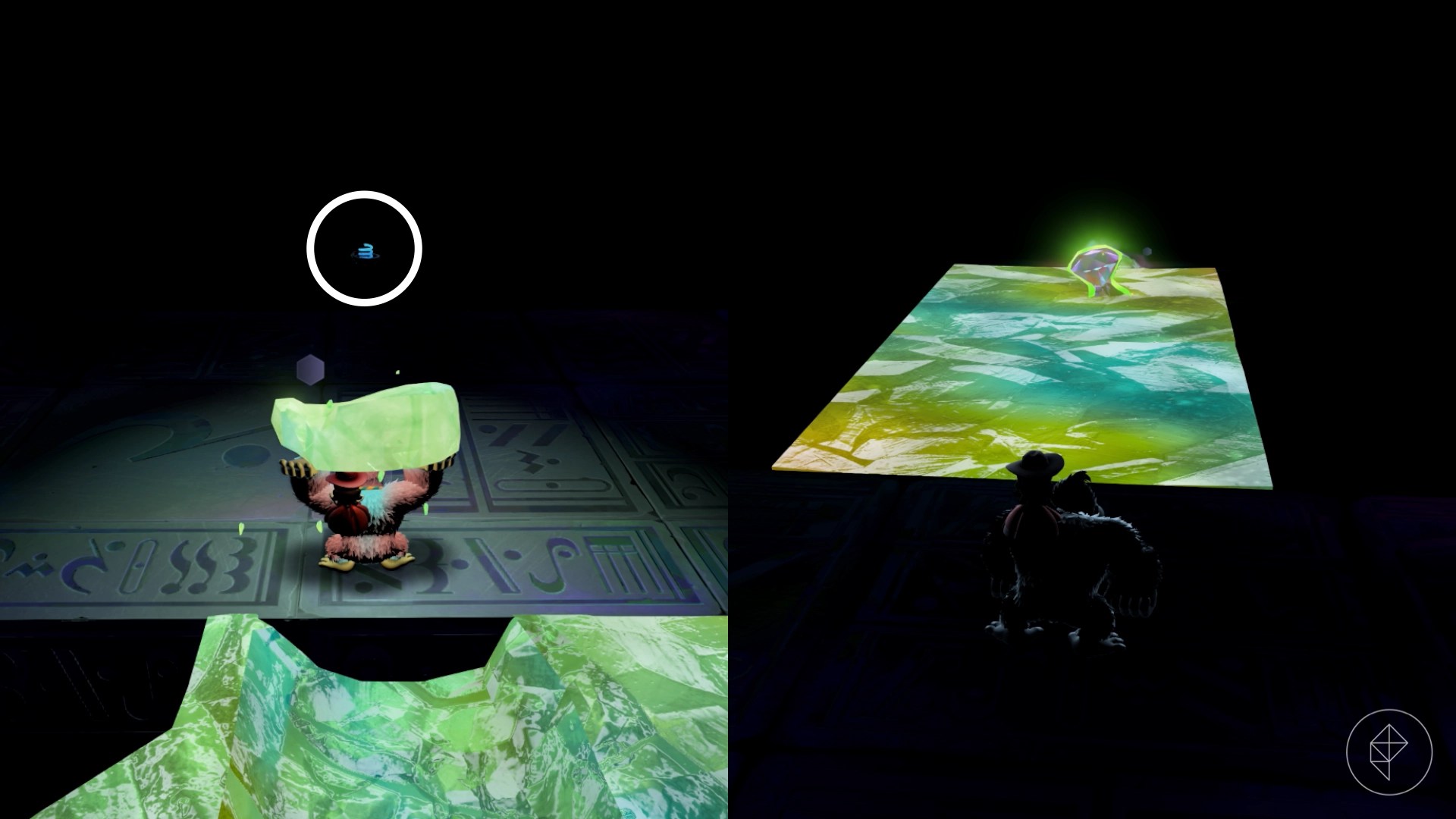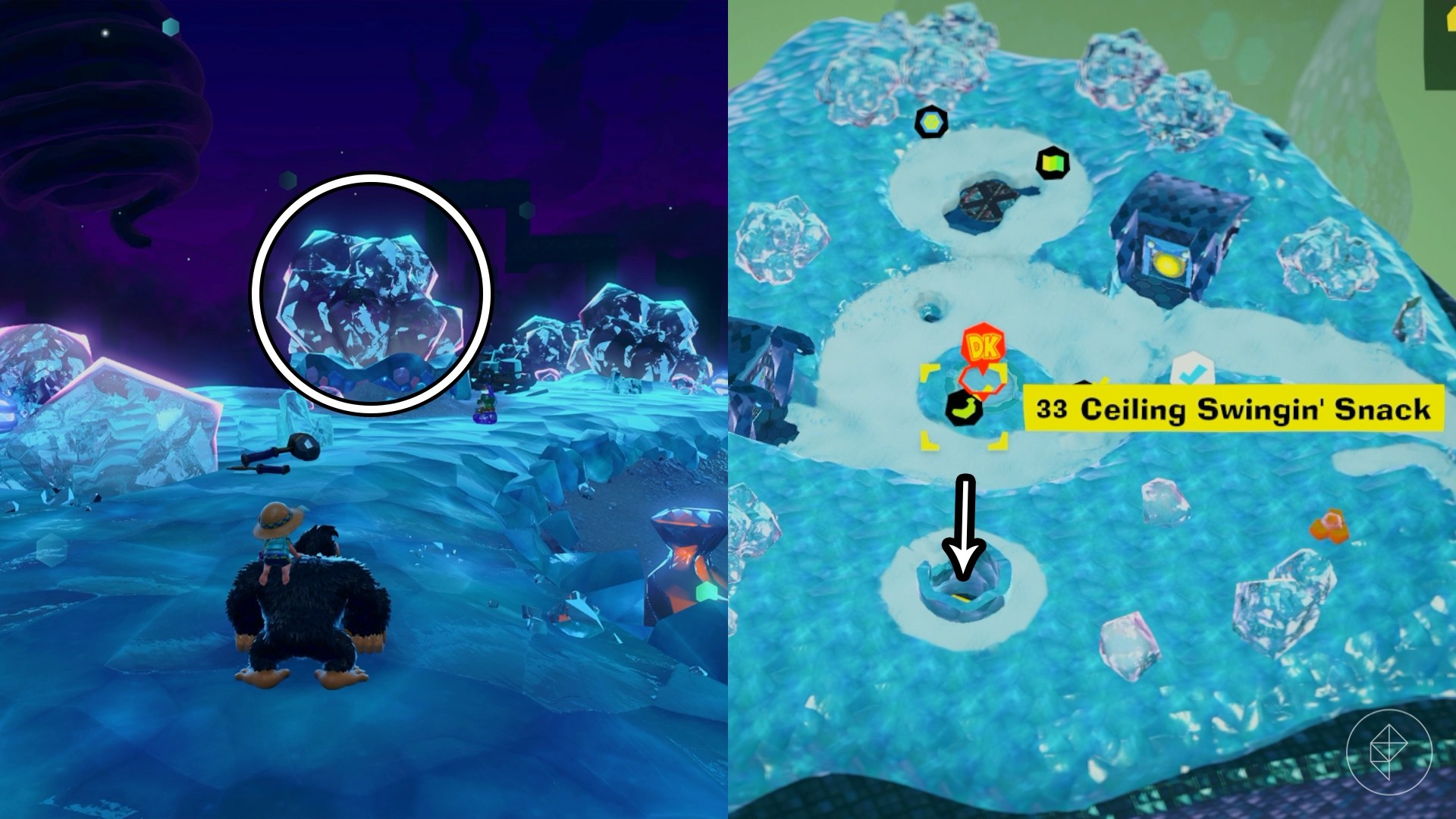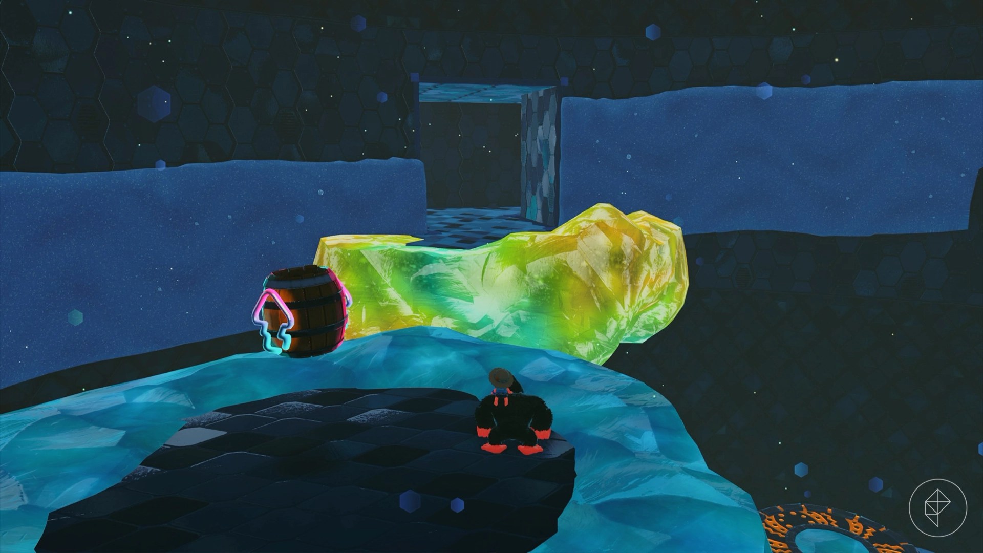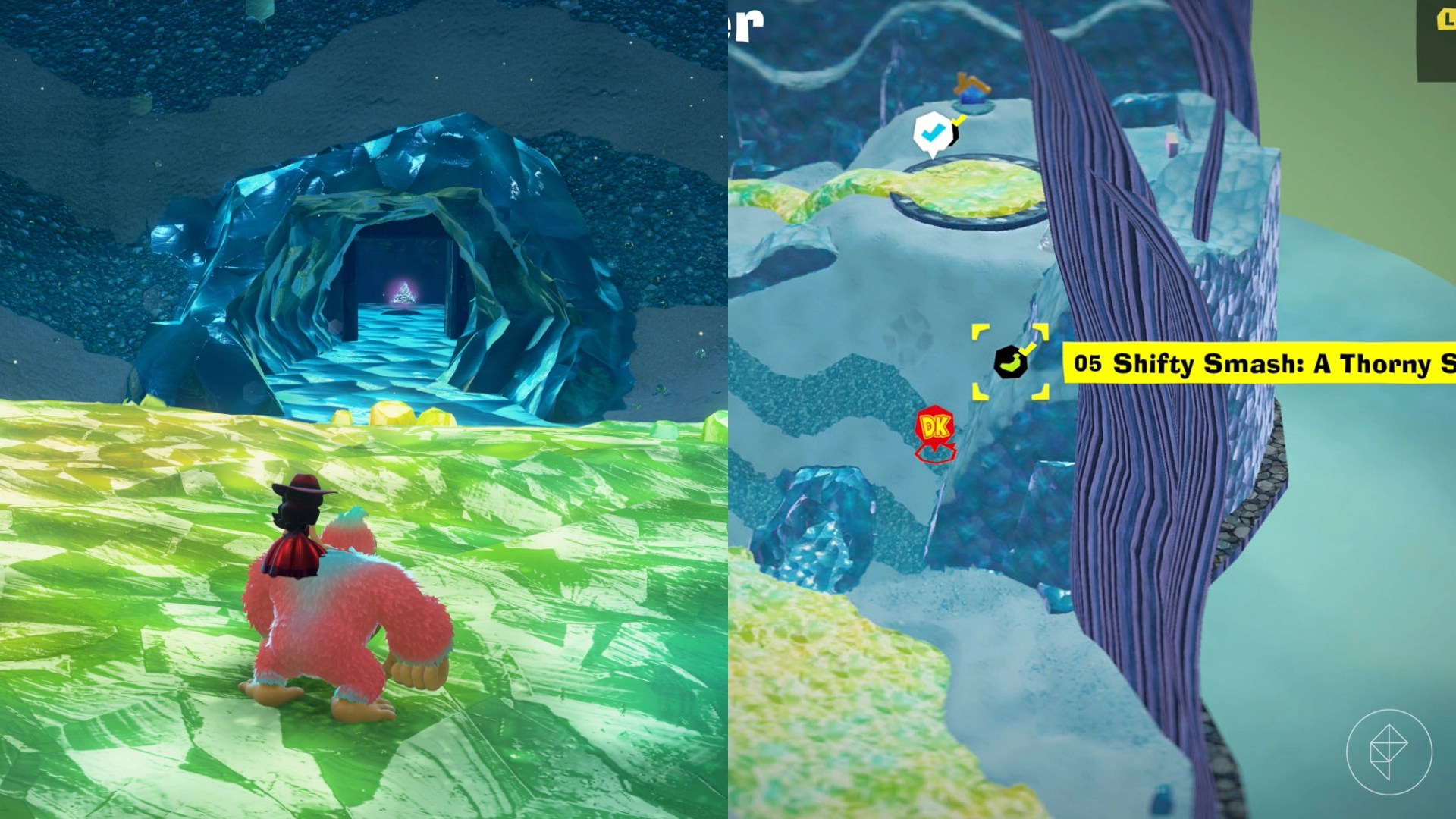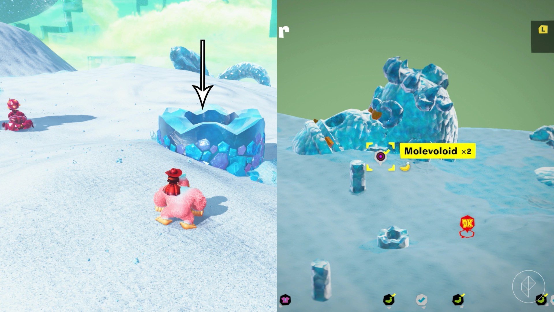 Break open the cracked wall to find and complete this combat challenge for your banana. You’ll need to defeat five crockoids that have to be exposed to light first to win.