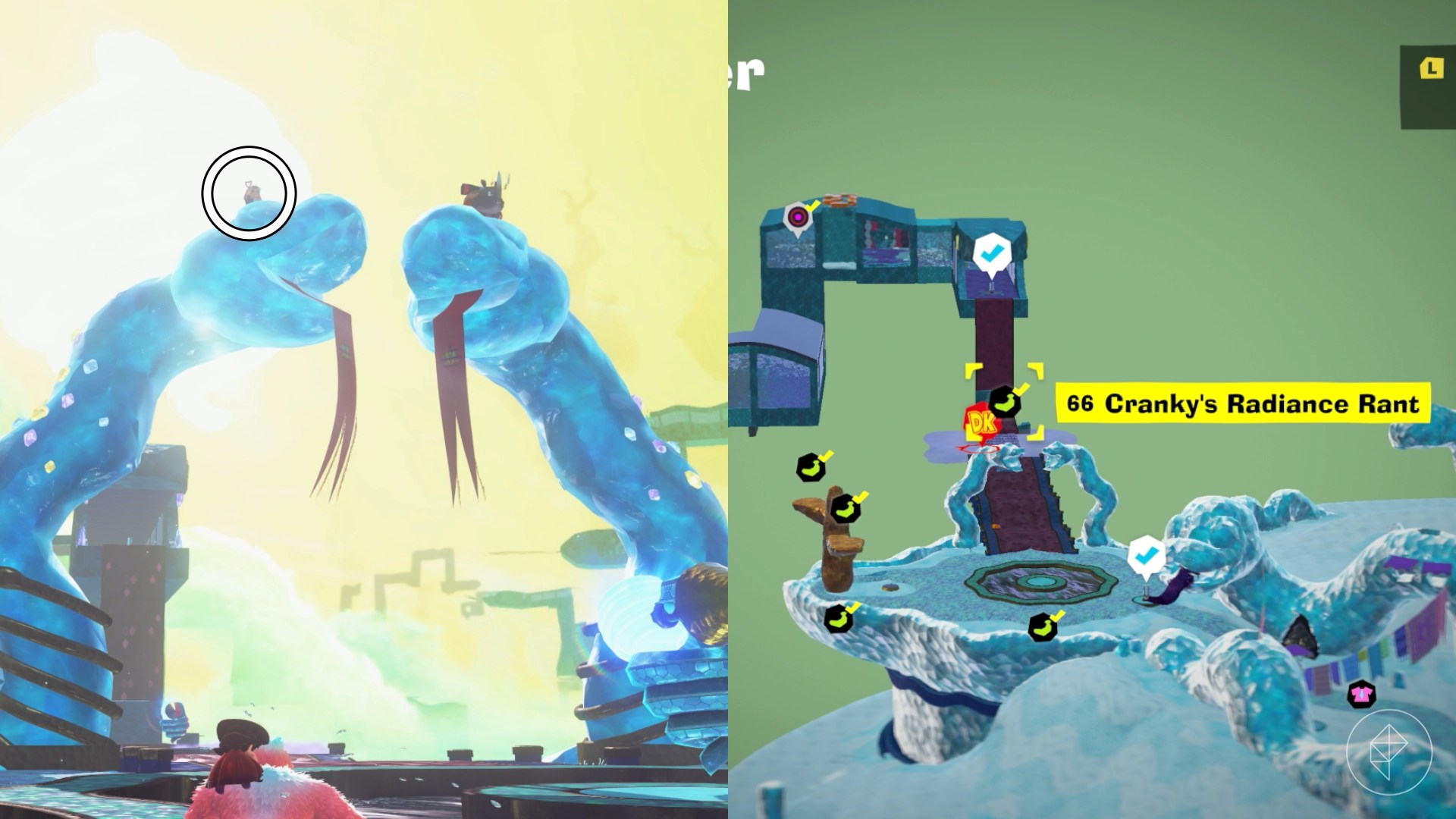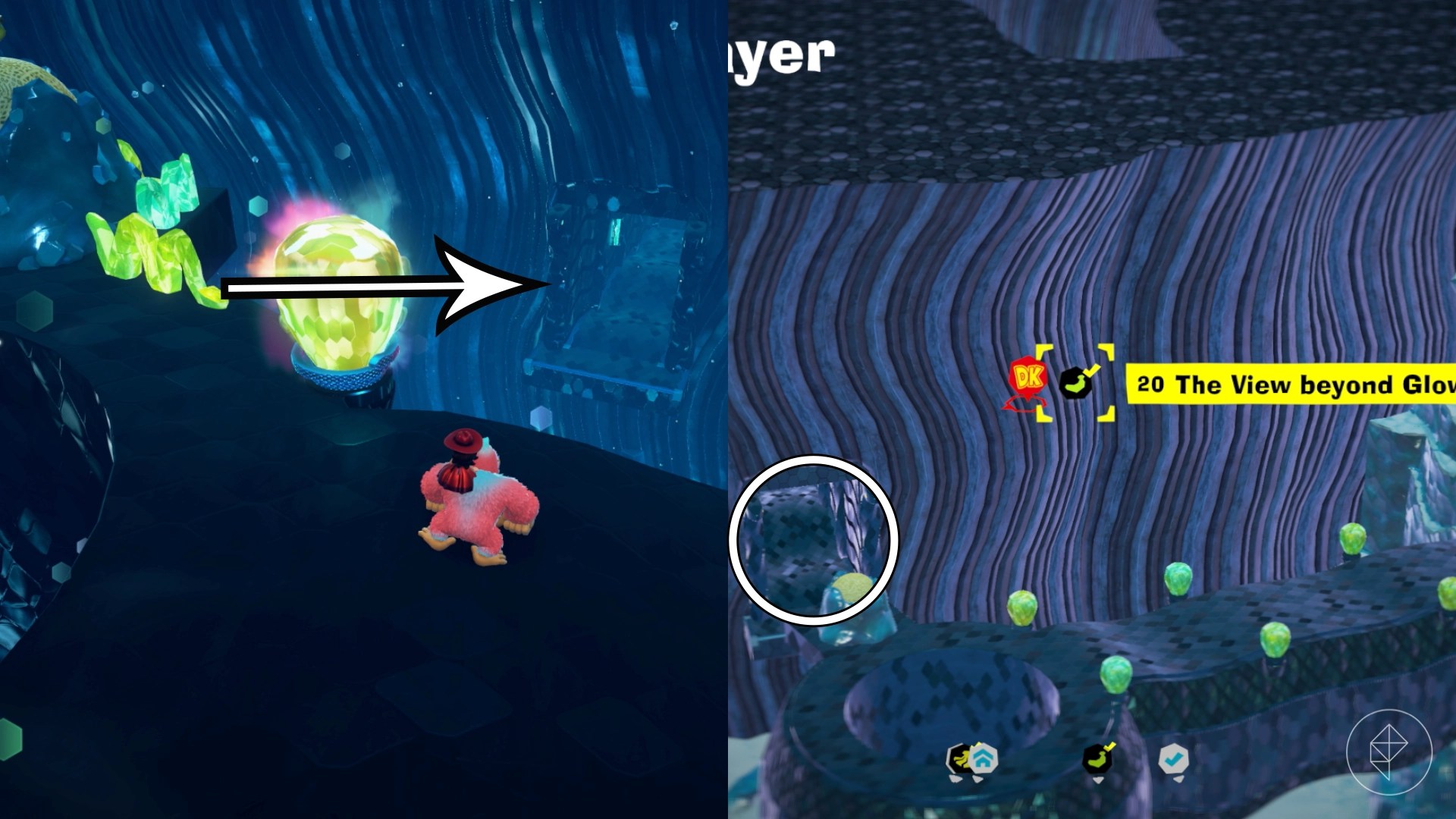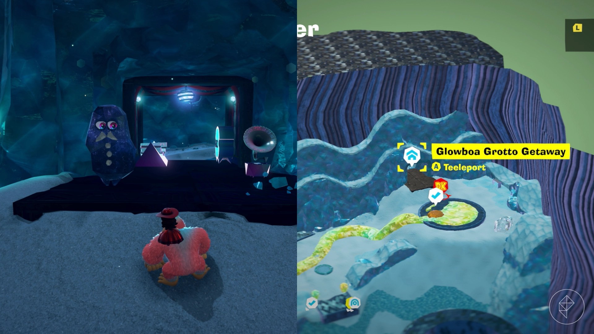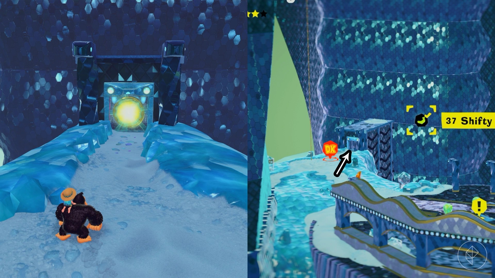 Break open the cracked wall to find and complete this combat challenge for your banana. You’ll need to defeat five crockoids that have to be exposed to light first to win.