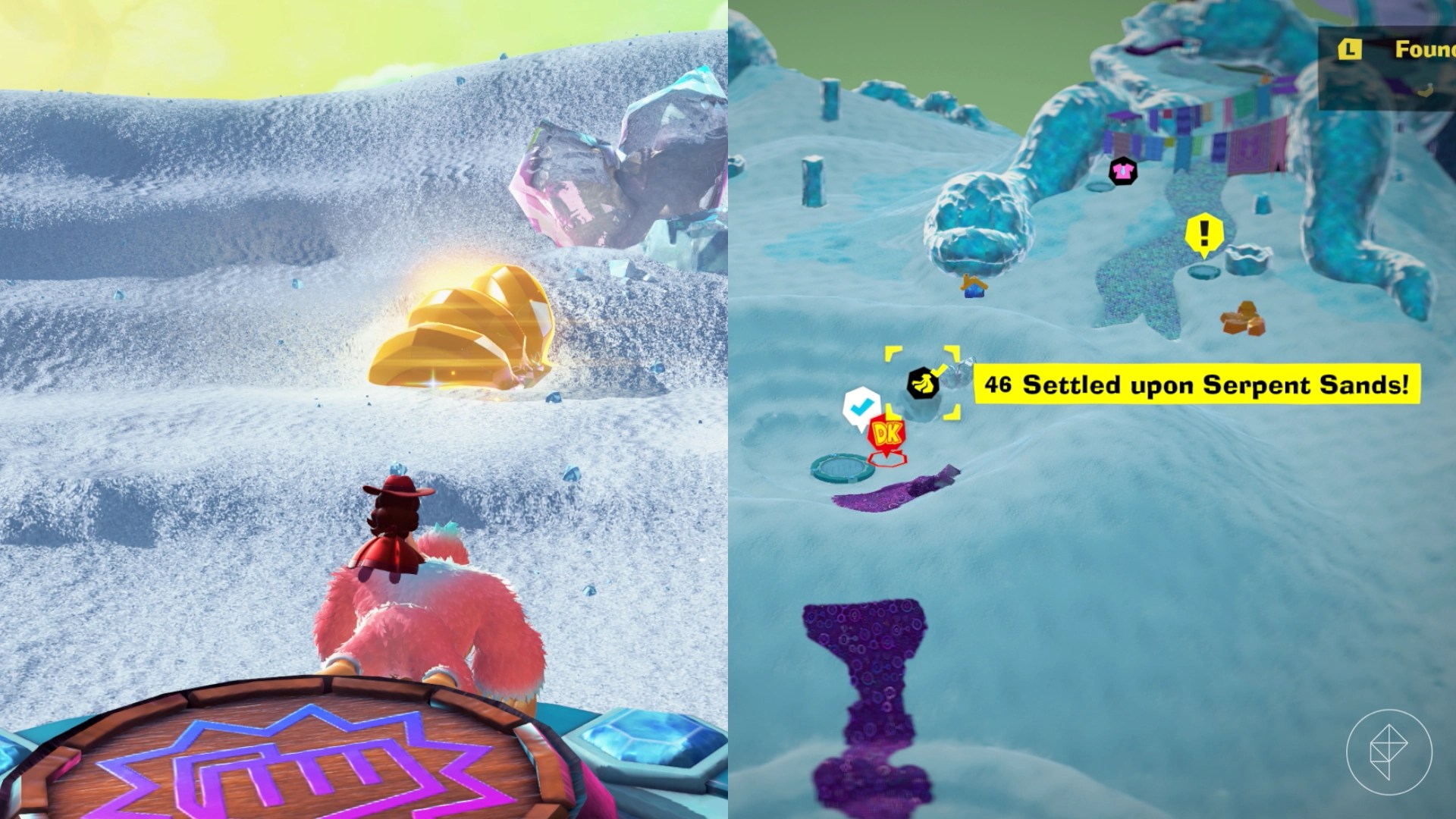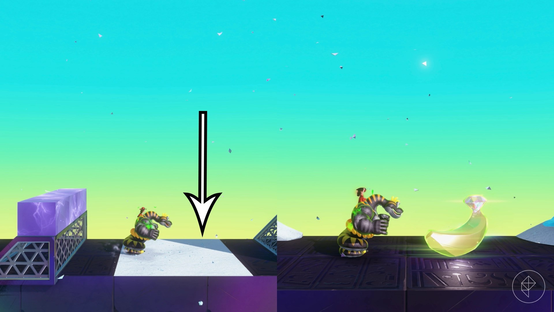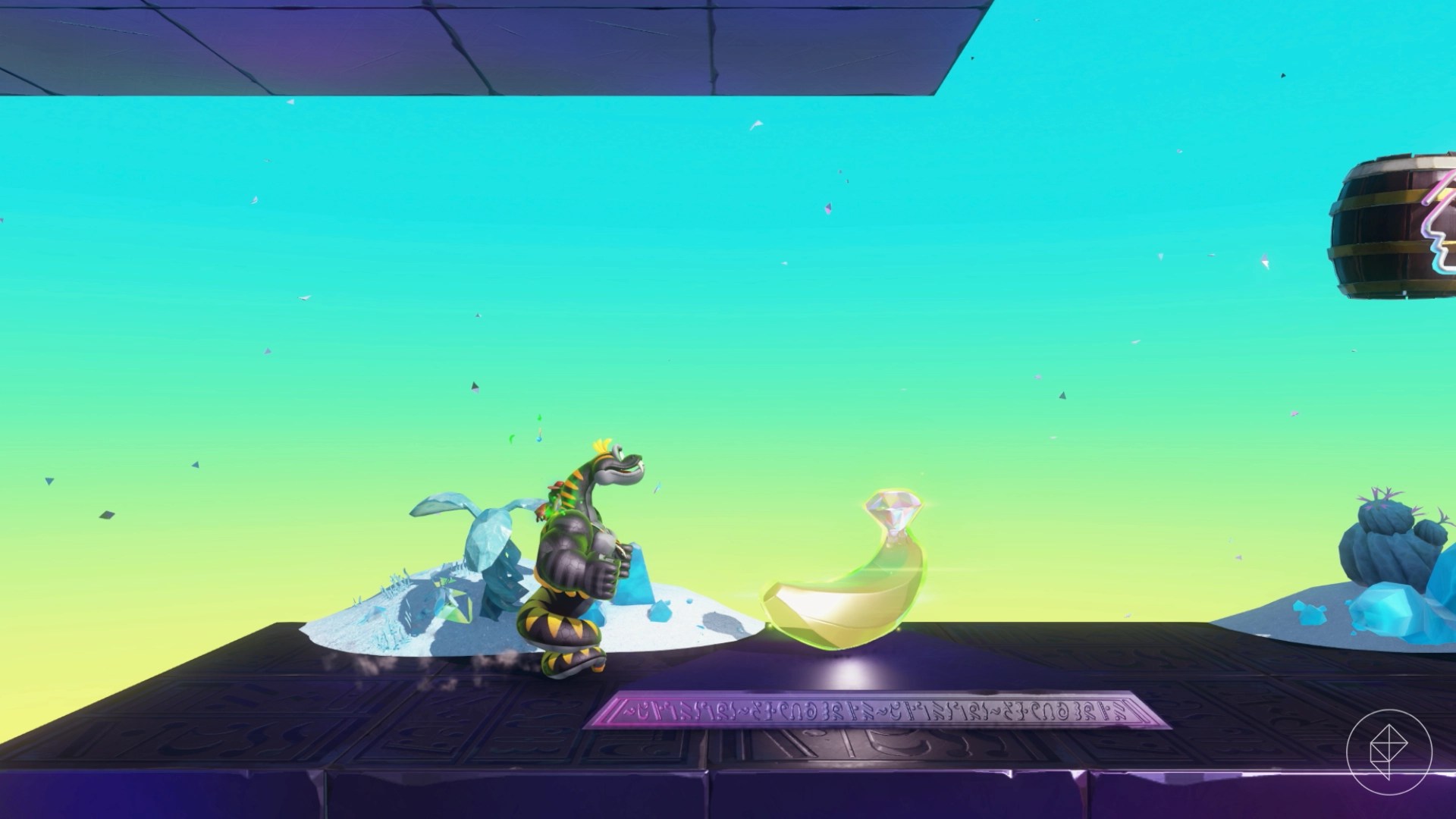 After you’ve turned on the synthetic sun, drop down to the bottom of the Sculptors’ Studio to find the lit up door. Head inside to find a shifty triangle, but before you start, make sure to fill up your bananergy by hitting the nearby melon. Transform into your snake form and hit the challenge to start it. Charge jump your way to the top and destroy the block to get your banana.