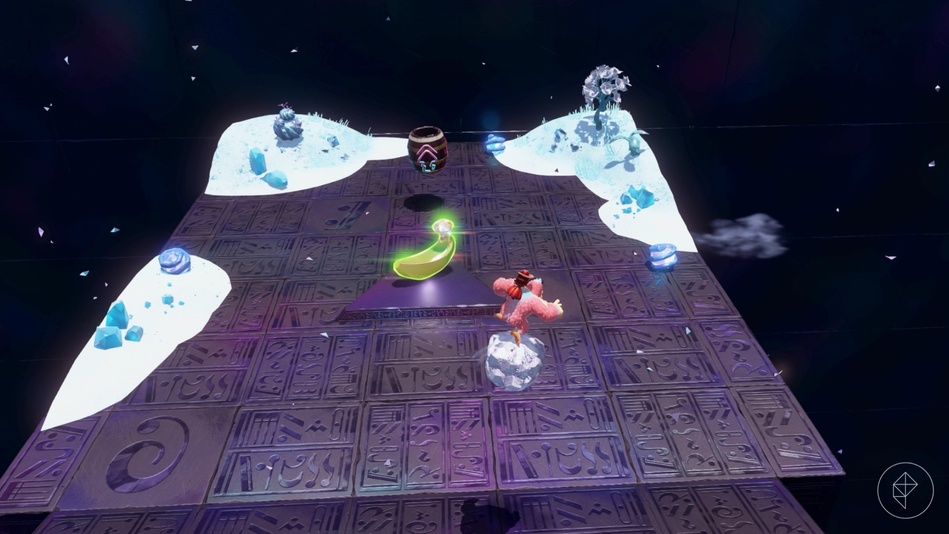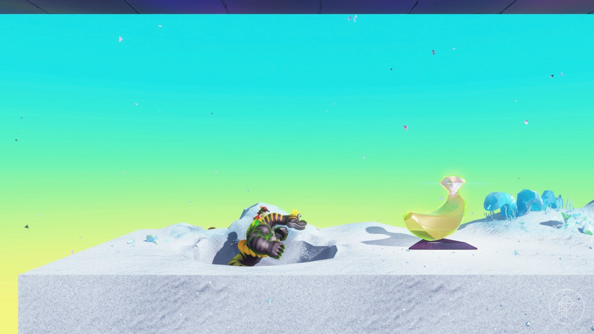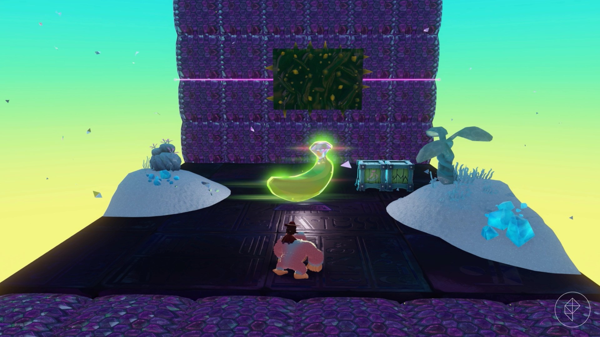 Jump into this hole and follow the path to find our buddy Smashintone, who will give you a banana if you’ve smashed 70,000 cubic meters of crystal in the layer. Keep in mind that crystal is the glass-looking terrain you can find around the Window Viper, not the ice-like stuff that the snake sculptures are made of (that’s actually technically stone).