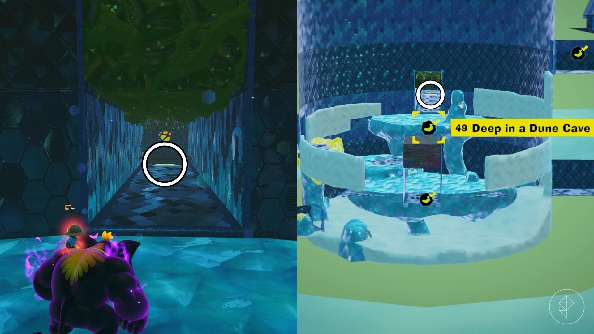 On the second level of the dune underneath the starting point in Sublayer 1203, you’ll find a hallway full of thorns along with a trapantuloid inside. Transform into your elephant form and suck up the thorns to easily defeat the enemy. Under where the trapantuloid used to be, you’ll find a patch of glow stone. Break it and drop into the hole to find a banana hiding inside.
