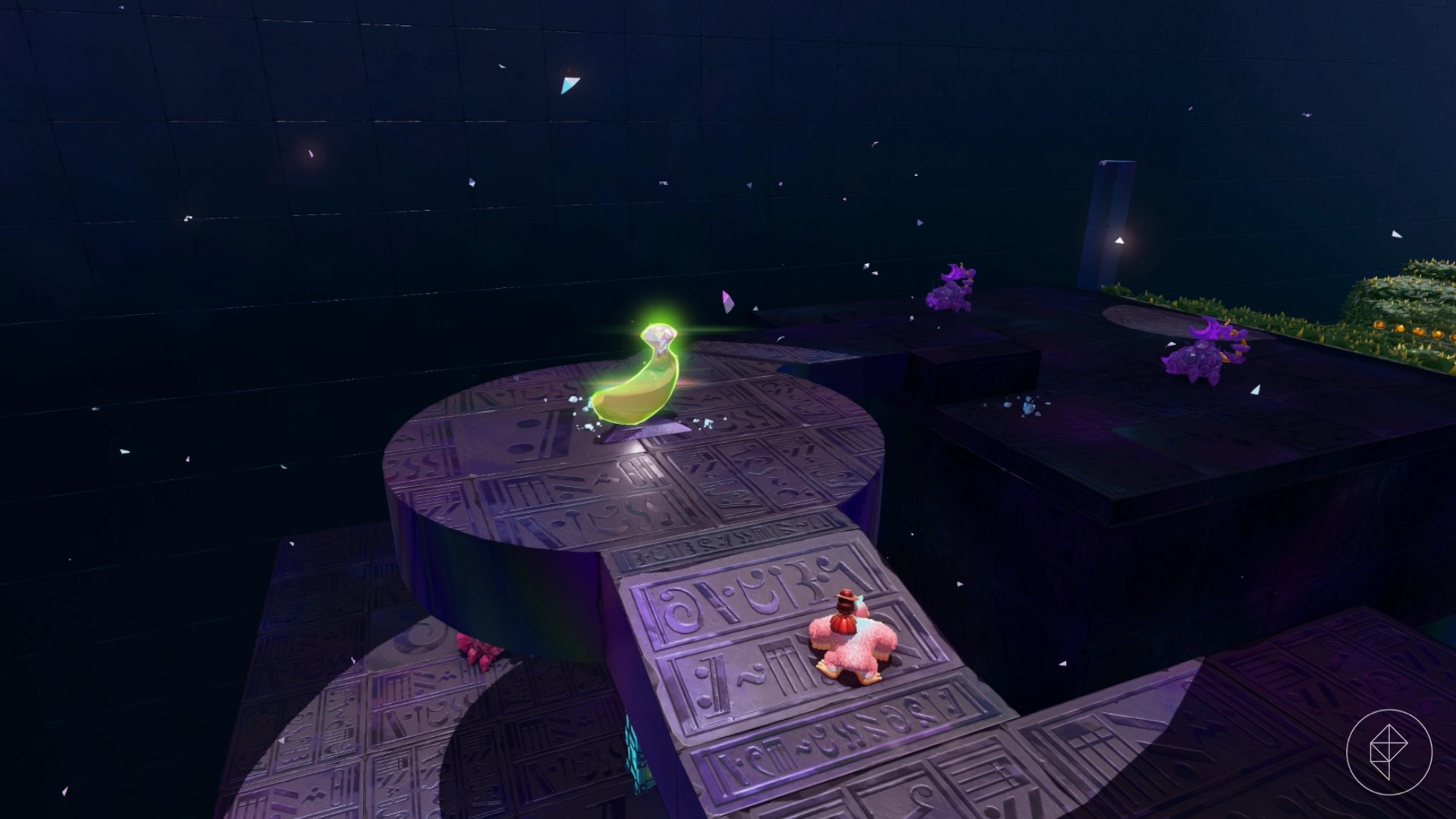 Dig down in this snake sculpture’s mouth to drop onto a Fragmentone that needs your help. You just need to escort the fragments back along this path in the dark, so grab a chunk of the nearby glow stone to light the path. The only big obstacle are moving walls that will push the fragments off, so move quickly past them. You’ll get this banana for bringing back one fragment to the Fragmentone.