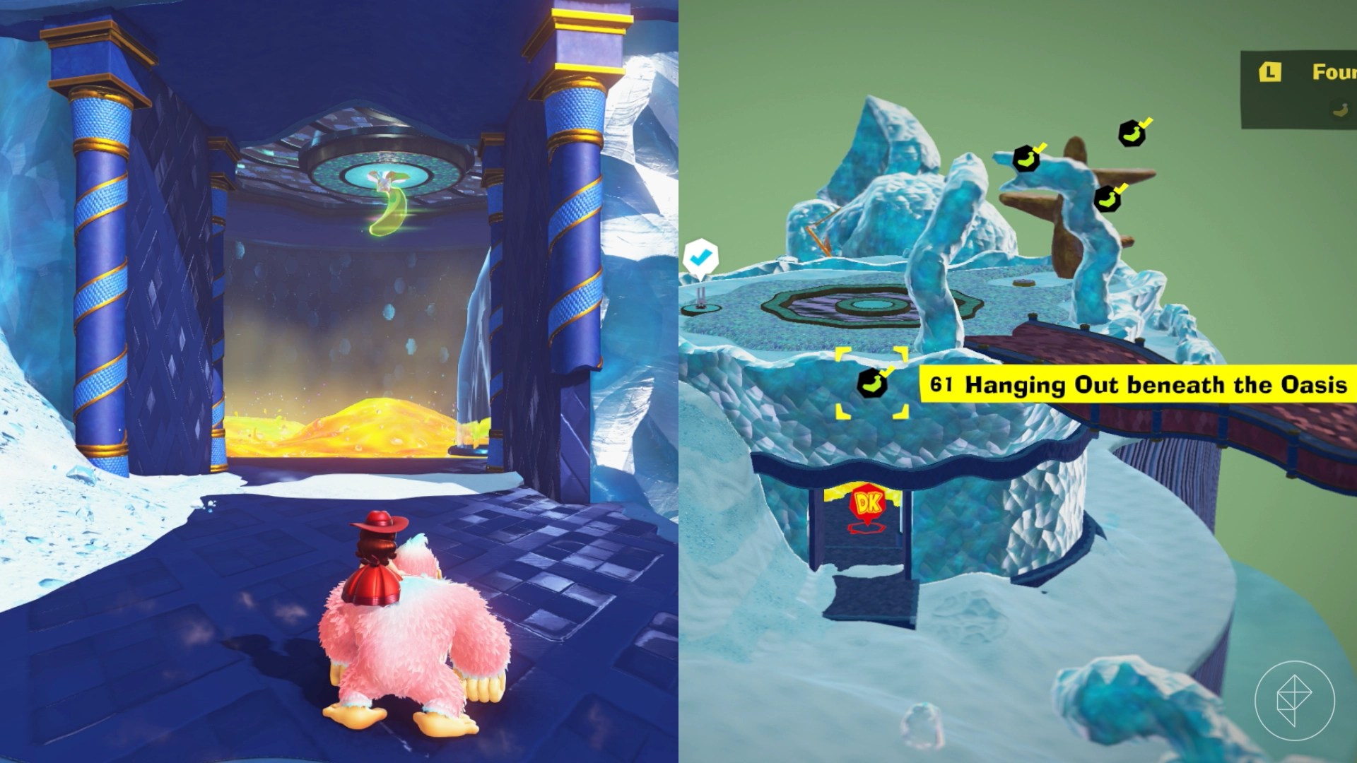 Cranky and Rambi are standing on the top of snake-shaped sculptures by the oasis. Just climb up and talk to the old monkey to get your banana.