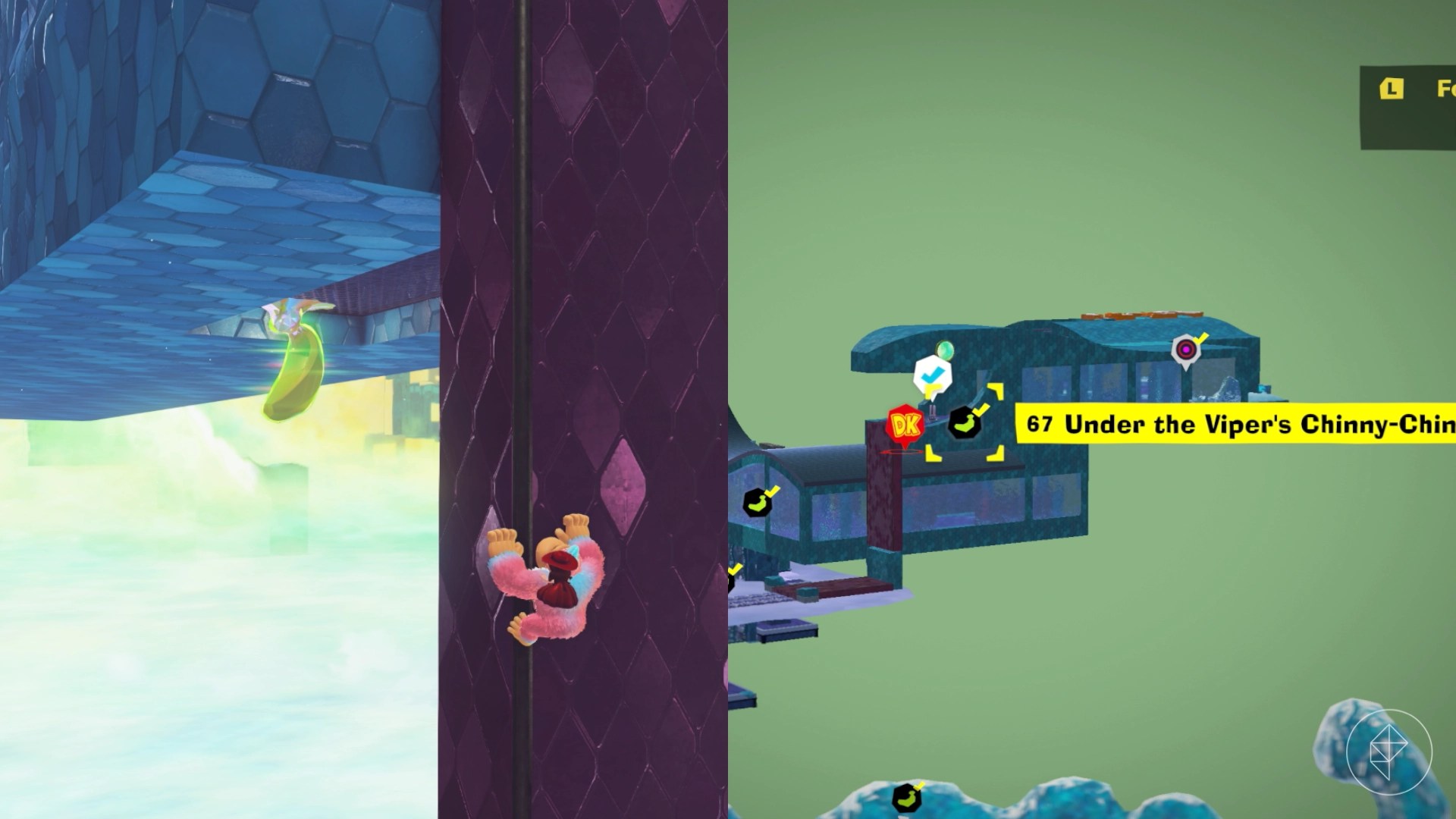This banana is practically right under the Window Viper tuning fork. Use the viper’s “tongue” to climb around to the banana, which is dangling from a roof road that you can use.